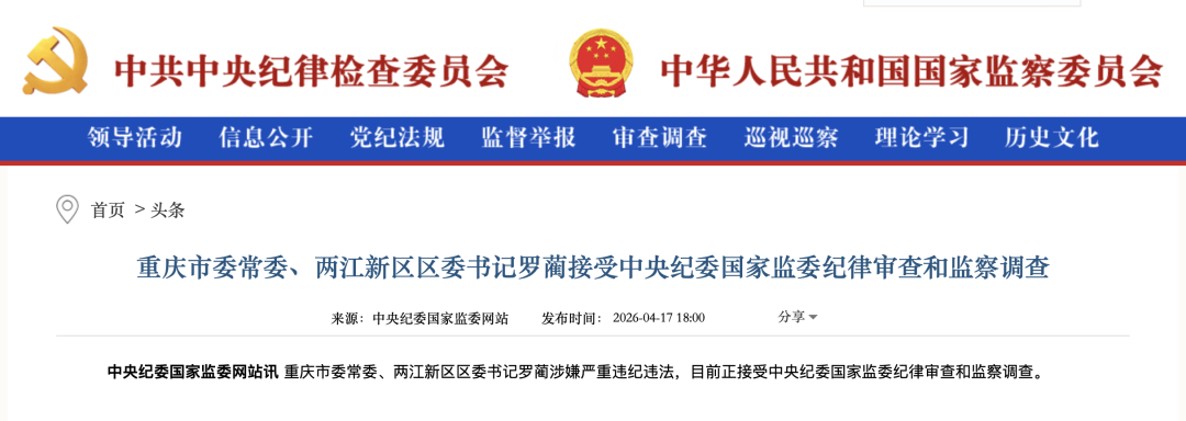 重庆市委常委、两江新区区委书记罗蔺接受中央纪委国家监委纪律审查和监察调查