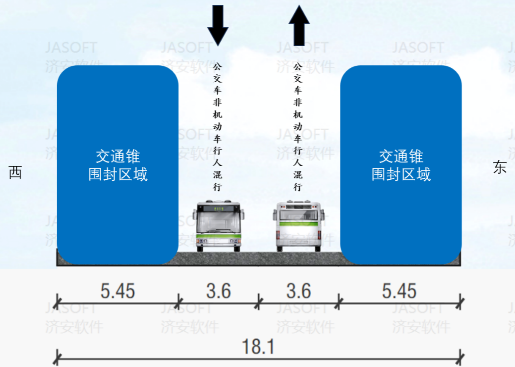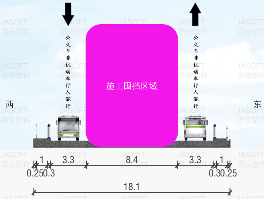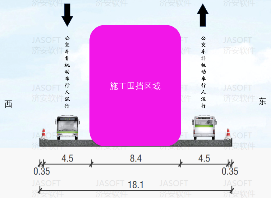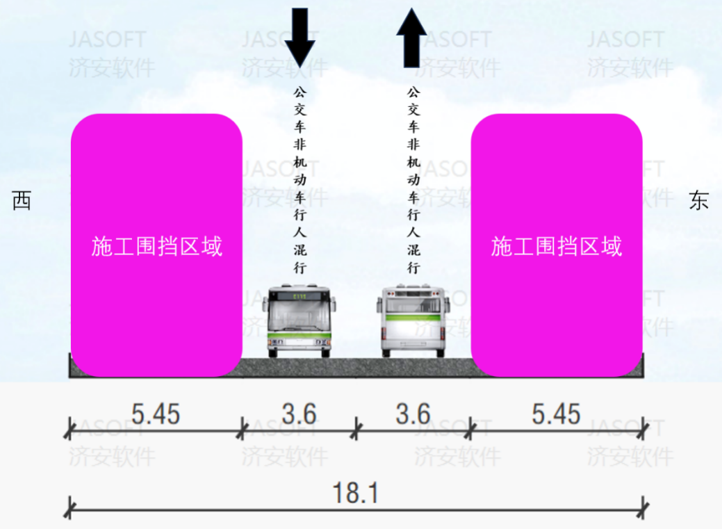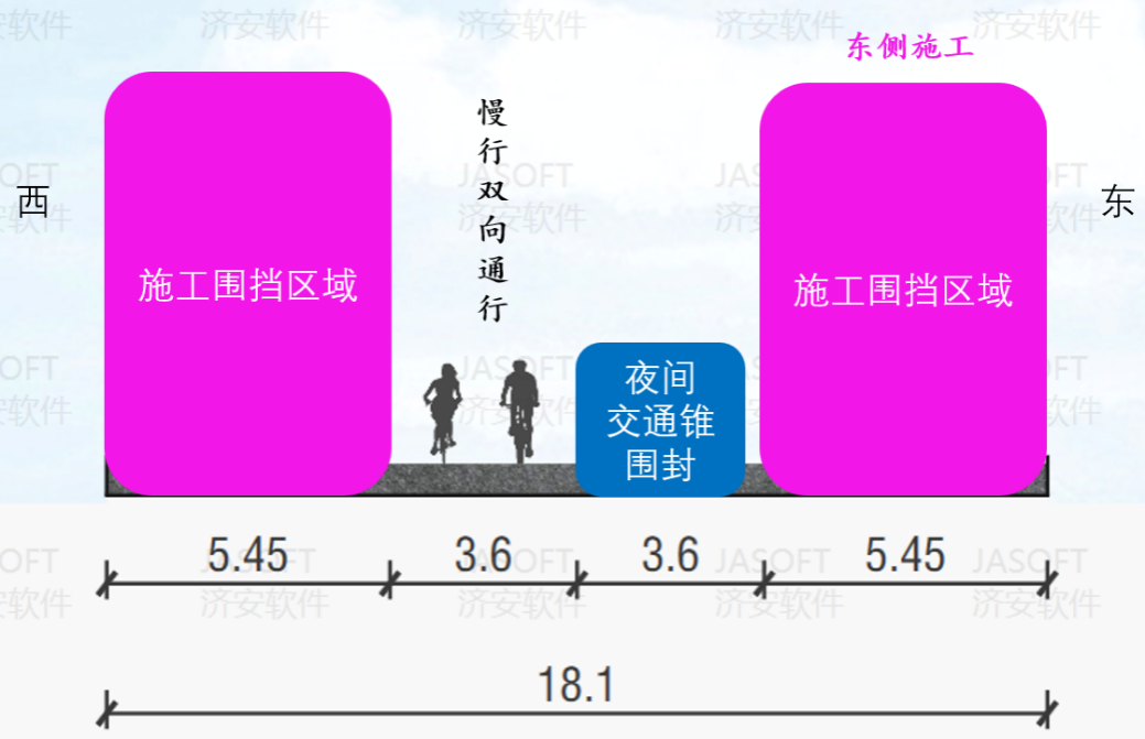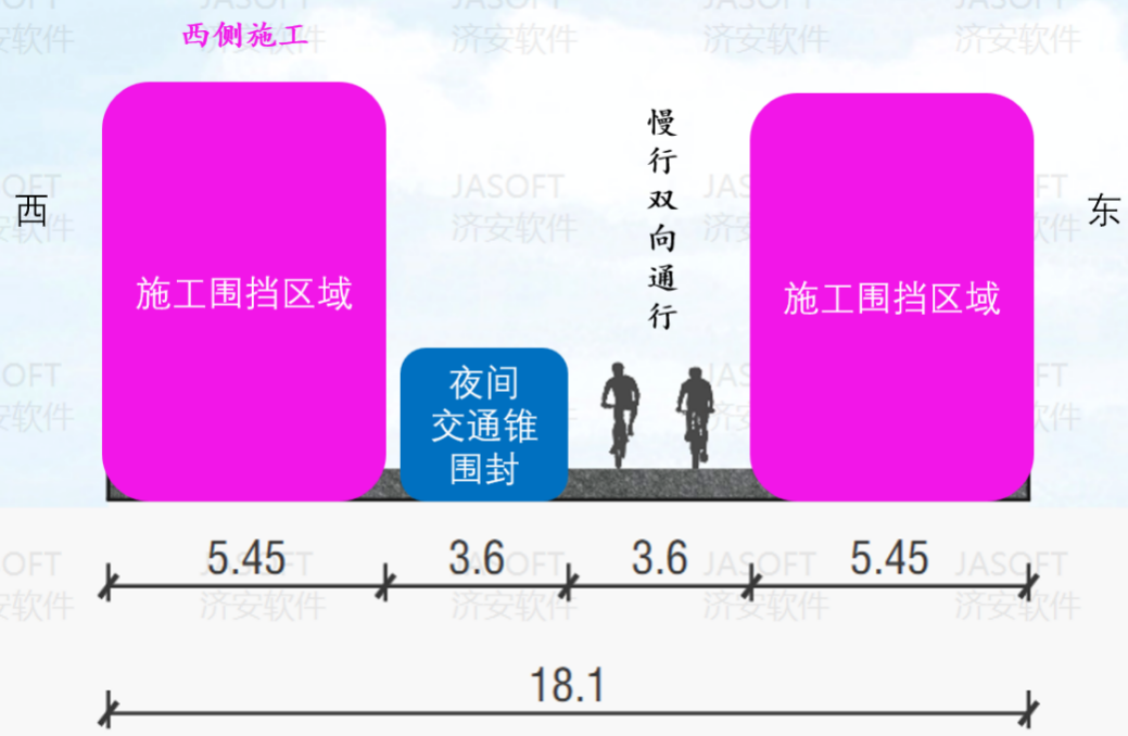 工程采用全天施工模式,分三个阶段推进施工,作业区全天围挡施工,具体通行方案如下:
