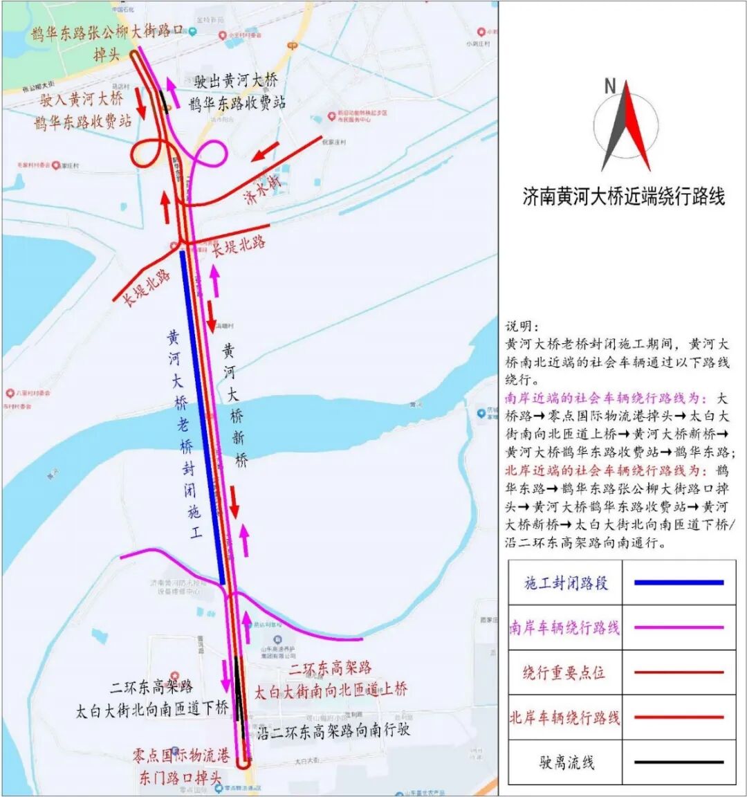 南岸:通行二环东高架路的车辆请保持桥上通行,地面车辆可通过太白大街上桥口和泺华路上桥口驶入二环东高架路,经黄河大桥(新桥)通行;二环北路、小清河北路西向行驶的社会车辆,可绕行至济泺路黄河隧道通行。