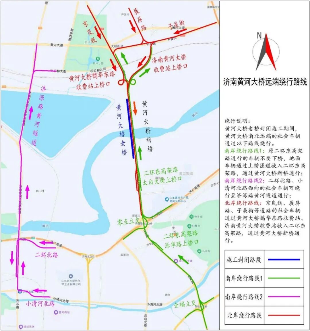 施工期间黄河大桥(老桥)禁止社会车辆通行,建议社会车辆绕行至黄河大桥(新桥)和济泺路黄河隧道通行,具体绕行路线如下: