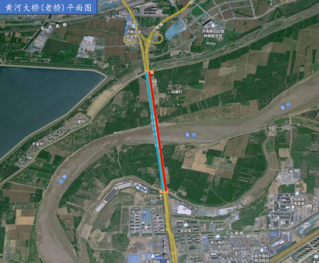 南岸:大桥路→零点国际物流港掉头→太白大街上桥口→黄河大桥(新桥)→黄河大桥鹊华东路收费站→鹊华东路;