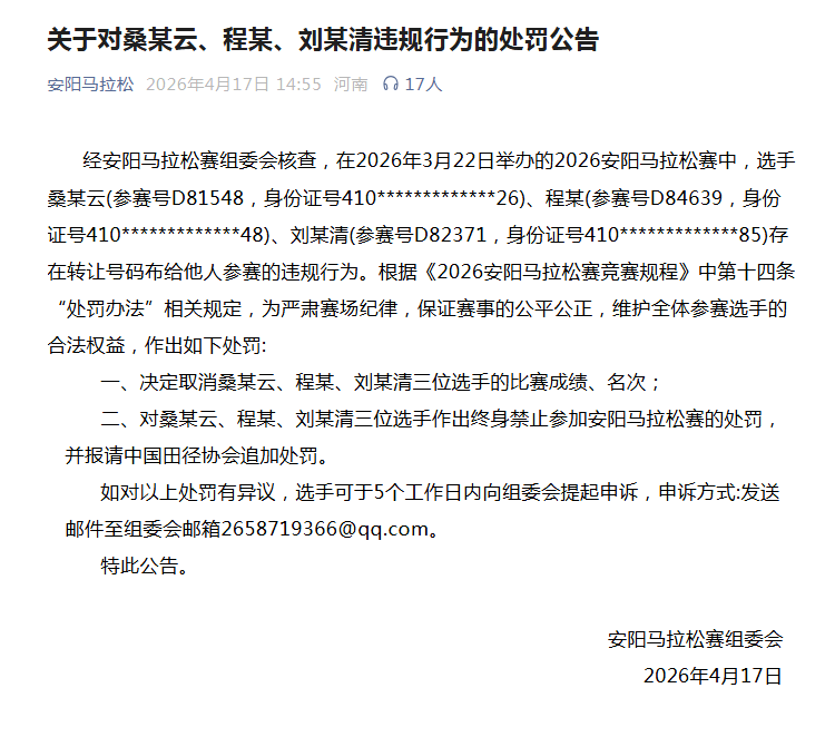 经安阳马拉松赛组委会核查,在2026年3月22日举办的2026安阳马拉松赛中,选手桑某云(参赛号D81548,身份证号410*************26)、程某(参赛号D84639,身份证号410*************48)、刘某清(参赛号D82371,身份证号410*************85)存在转让号码布给他人参赛的违规行为。根据《2026安阳马拉松赛竞赛规程》中第十四条“处罚办法”相关规定,为严肃赛场纪律,保证赛事的公平公正,维护全体参赛选手的合法权益,作出如下处罚: