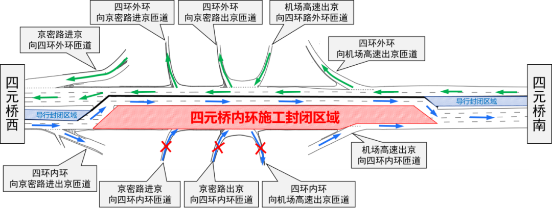4月18日0时至19日24时,将实施四元立交桥系四环主路内环施工,采取“分幅占路、对向导行”保障通行,同步封闭京密路进京向四环内环匝道、京密路出京向四环内环匝道、四环内环向机场高速出京匝道3条关联匝道。