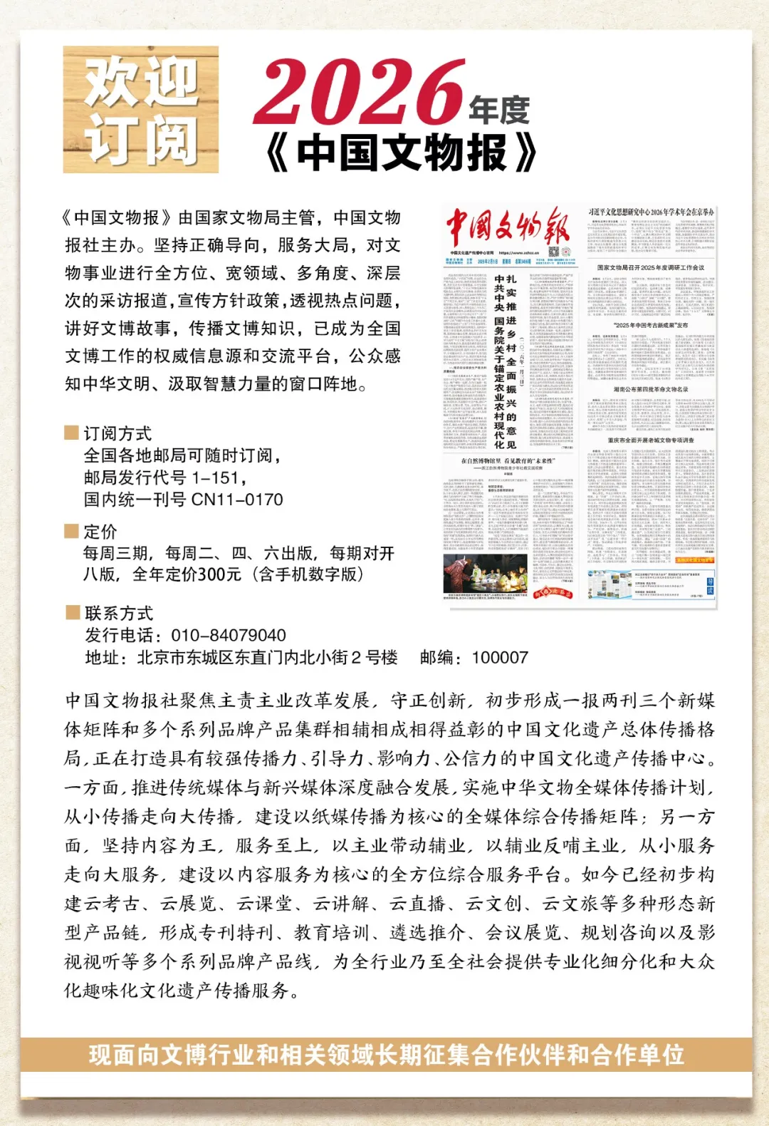 中国文物报社1989年于北京组建,是国家文物局主管的中央文化企业(司局级),全国文物行业唯一具备新闻资质的媒体单位。作为文物宣传工作的主力军,承担着文物舆论引导、新闻宣传、成果展示、知识普及和文化传播等职责。主要负责《中国文物报》编辑出版,国家文物局政府网站、“国家文物局”微信公众号运维管理,中国文物报社所属网站及新媒体的运维拓展等工作。
