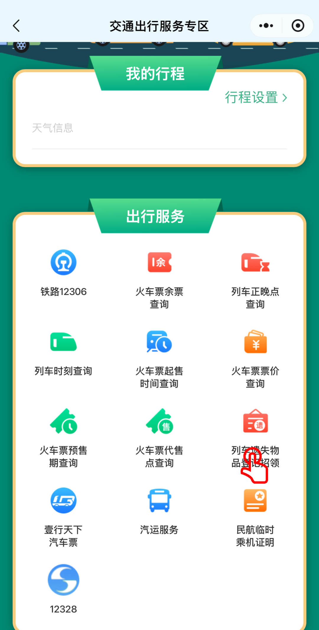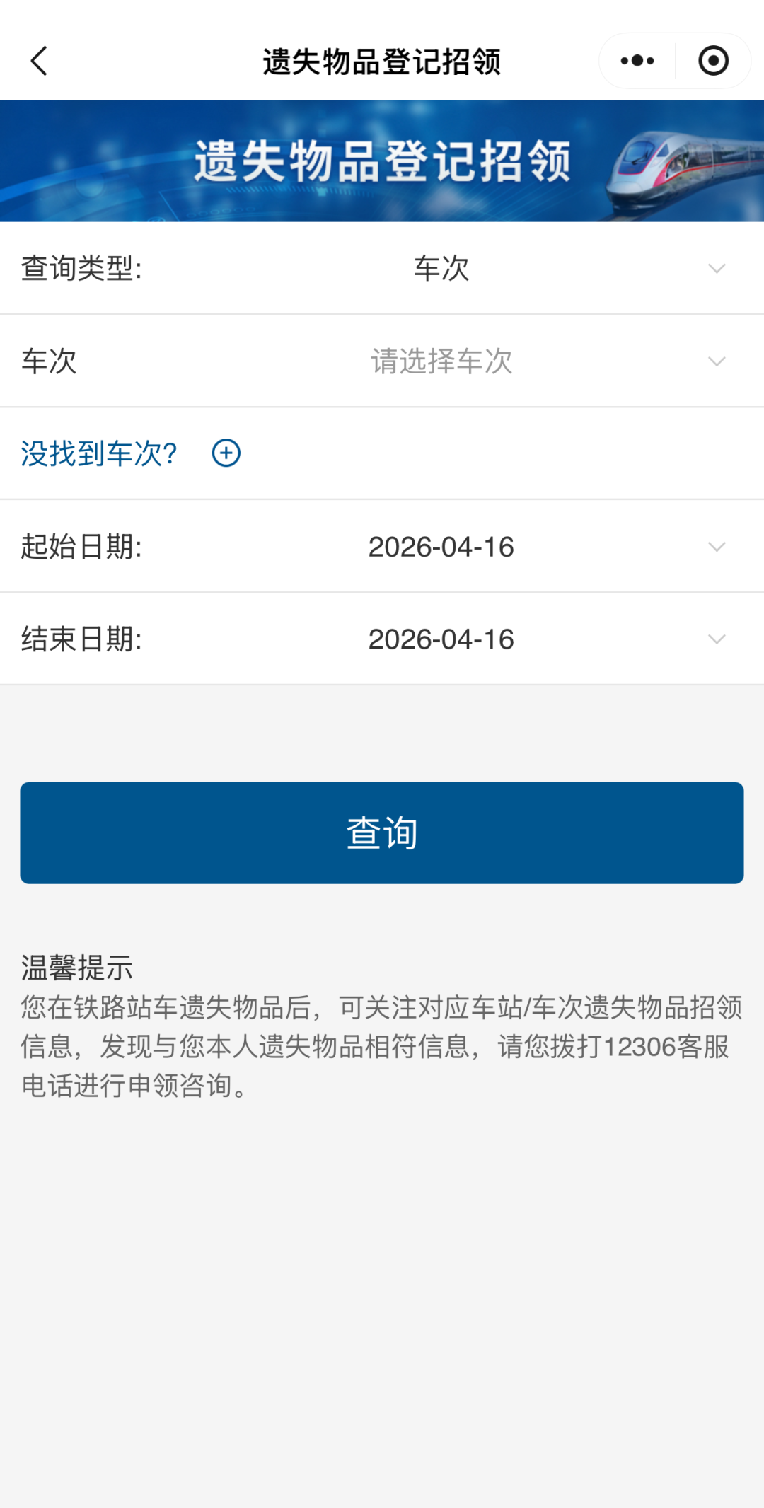 出行时,时常担心在列车上遗失物品?没关系,进入交通出行服务专区-列车遗失物品登记招领,只需提供车次或车站,即可查找遗失物品信息,凭身份证就能领取。