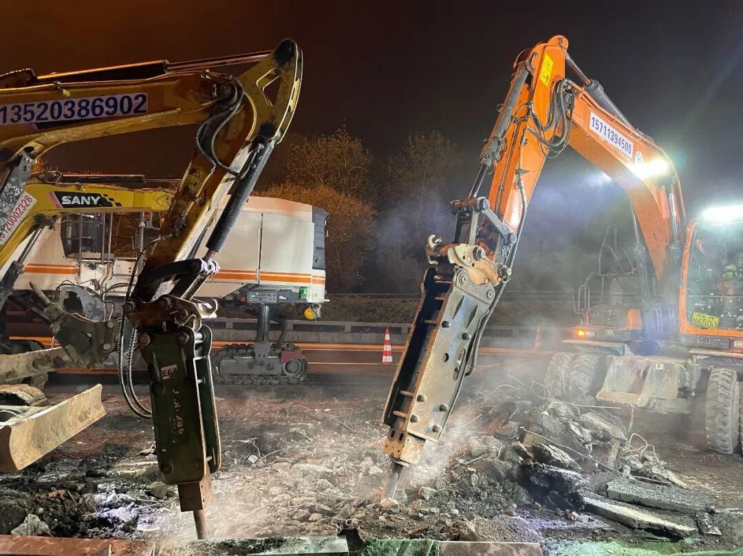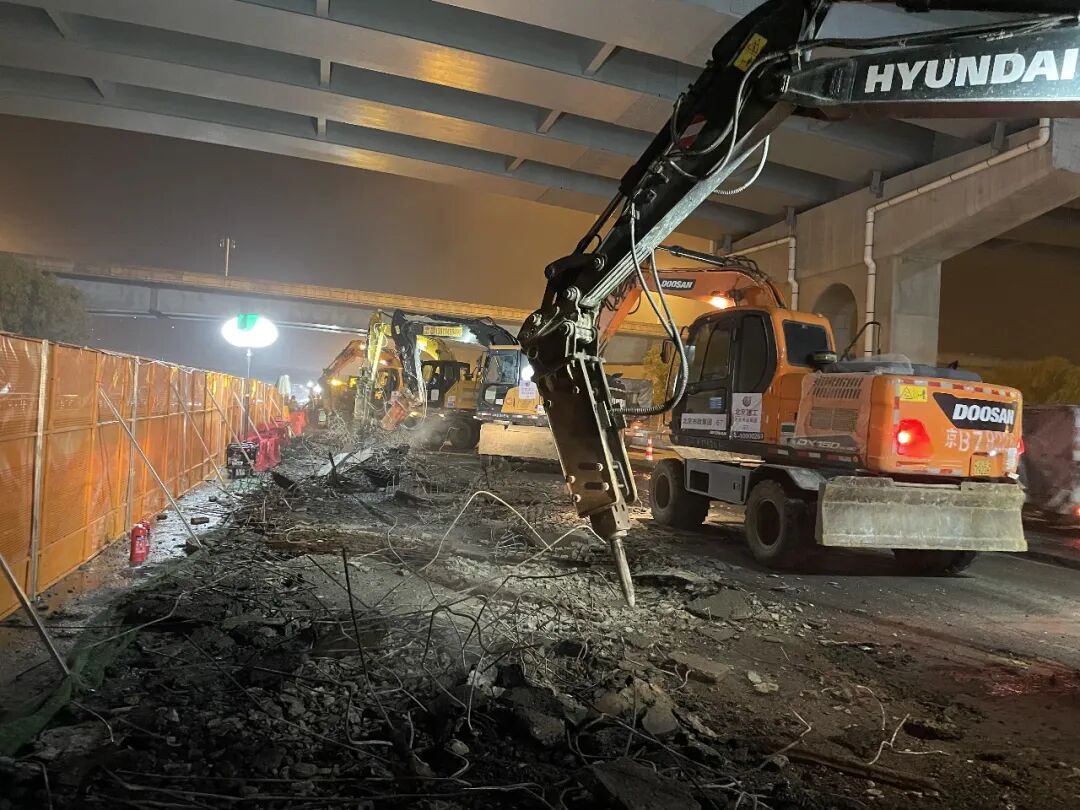 为此,破除混凝土铺装层时,会出动十余台小型破碎炮,用机器的钢头“击打”接触面,一点一点破除旧的铺装层。