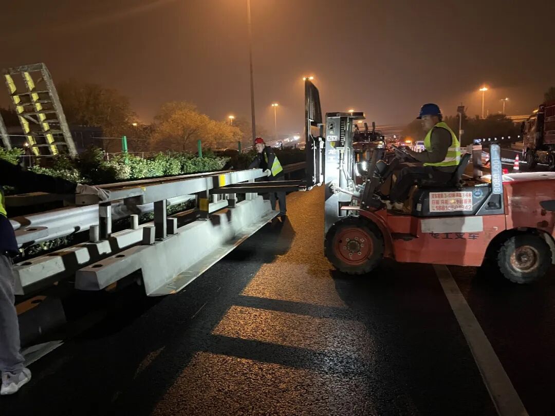 零点过后,施工导行启动了一项“大工程”——在叉车的行进配合下,将提前备好的一节节钢护栏放置在四元桥系四环路外环(逆时针方向)路面中间,将同方向四条车道临时隔离成两上两下,以此保证内环(顺时针方向)封闭施工的48小时内车辆可以“借道”通行。