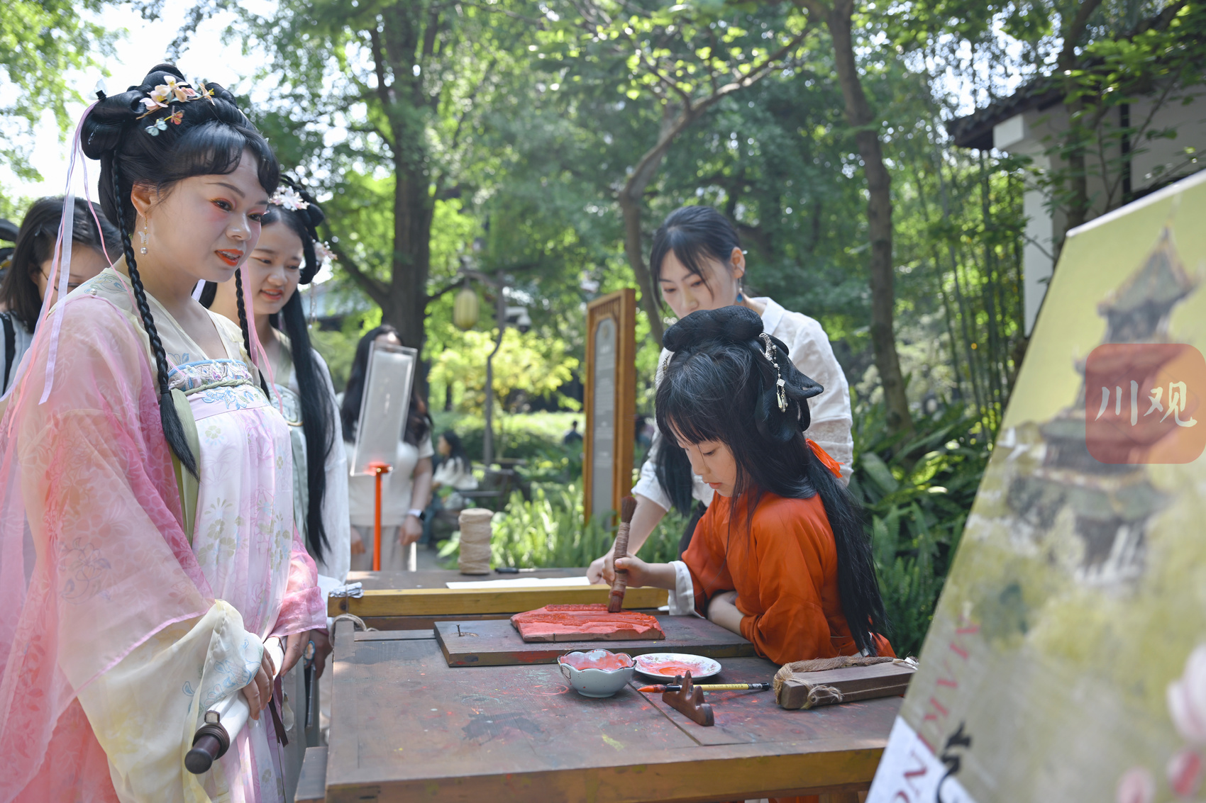 现场上演沉浸式演剧,复刻明代蜀王府取水制笺仪式:“薛涛”引领观众至薛涛井畔,演员以舞剧再现开井取水、捣花染笺等步骤,并由非遗代表性传承人完成薛涛笺木版水印制作。随后行祓禊之礼,观众在留言板书写书信。