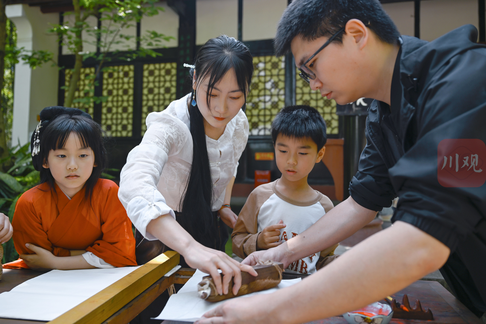 小朋友体验薛涛笺木版水印制作