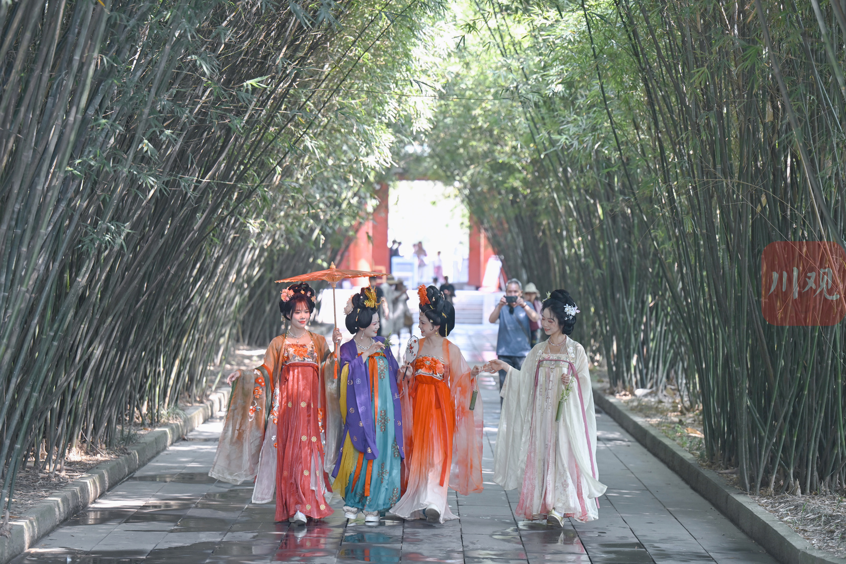 汉服爱好者在望江楼公园里游园