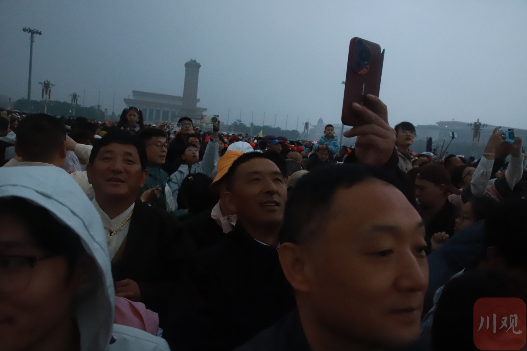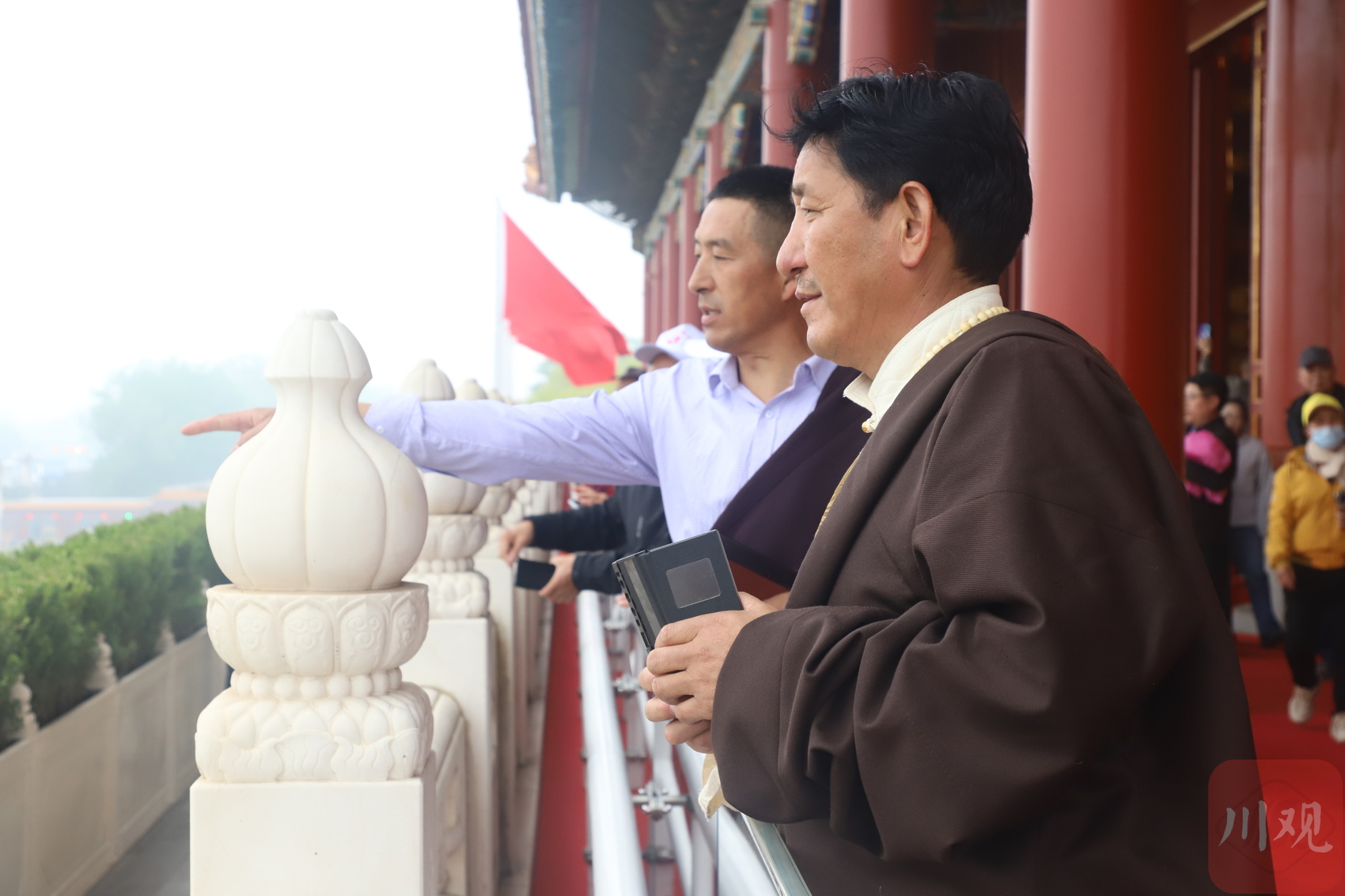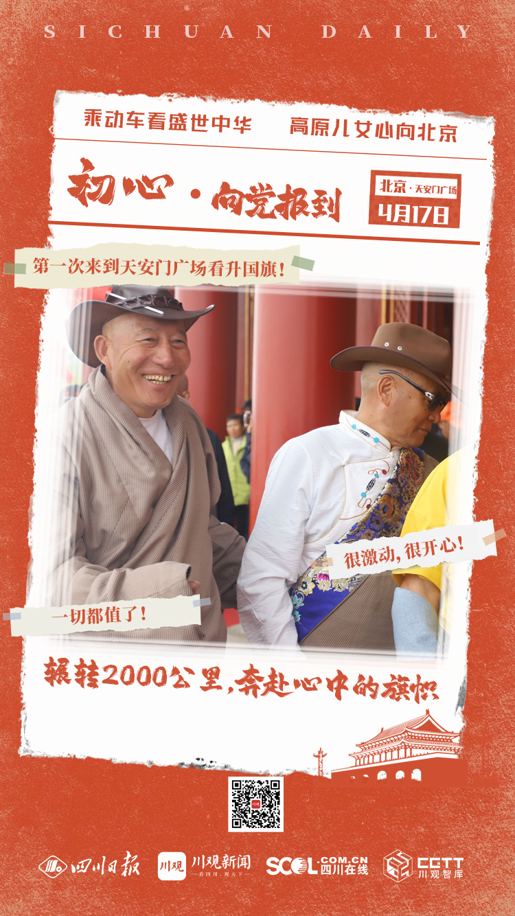 4月17日清晨的天安门广场人头攒动,来自全国各地的同胞汇聚于此,只为观看升国旗仪式。人群中,30位脸上挂着高原红的同胞,挥舞着手中的国旗翘首以待。他们是来自四川省阿坝藏族羌族自治州松潘县的离任村级党组织书记。