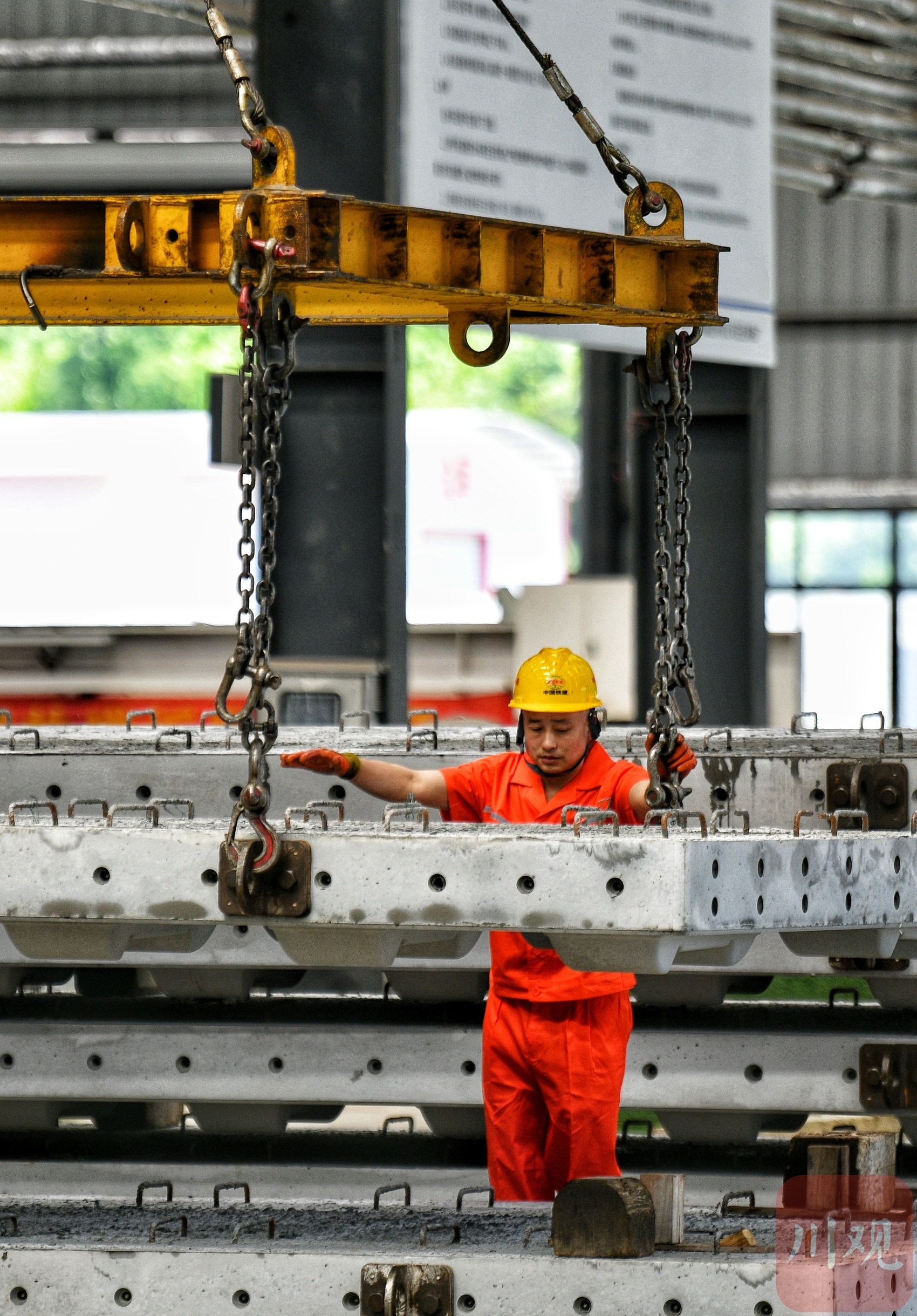 这双“铁板鞋”的核心就是预制轨道板。成渝中线高铁安岳制板厂,负责乐至至重庆段的轨道板生产。4月17日,记者走进厂区,工人正为最后一批轨道板忙碌着:先绑扎钢筋笼,搭起轨道板的“筋骨”;再施加预应力,给“筋骨”上劲儿;然后浇筑混凝土,等待成型。大约20小时,就能完成一次生产循环,一批轨道板“新鲜出炉”。