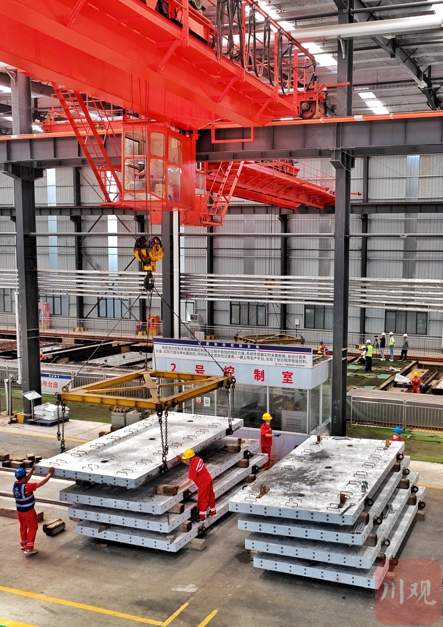 制板厂单日最高产能达128块,较传统工艺效率提升超20%,生产合格率始终保持100%。“每块轨道板均需经60余项严格检测方可出厂,为后续无砟轨道施工提供坚实保障。”中铁十一局成渝中线高铁安岳制板厂总工程师罗志强说。
