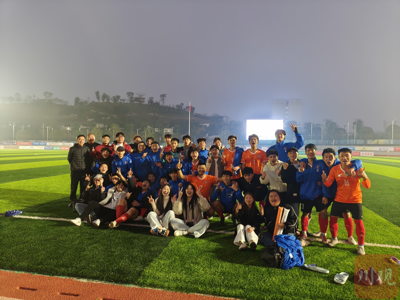 宜宾职业技术学院的球员们瞬间沸腾了。“加油!宜职院必胜!”大家围成一个圈,肩膀搭着肩膀,齐声喊出了那句每场比赛后都会喊的口号。人群中,队长呷觉木加看着记分牌笑容格外灿烂,他的16号球衣早已湿透,紧贴在后背上。这是今年足球联赛开赛以来,他们的连续第二场胜利。
