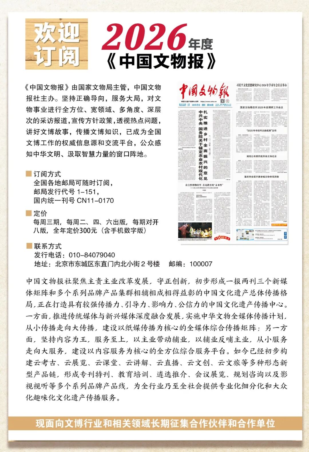 中国文物报社1989年于北京组建,是国家文物局主管的中央文化企业(司局级),全国文物行业唯一具备新闻资质的媒体单位。作为文物宣传工作的主力军,承担着文物舆论引导、新闻宣传、成果展示、知识普及和文化传播等职责。主要负责《中国文物报》编辑出版,国家文物局政府网站、“国家文物局”微信公众号运维管理,中国文物报社所属网站及新媒体的运维拓展等工作。