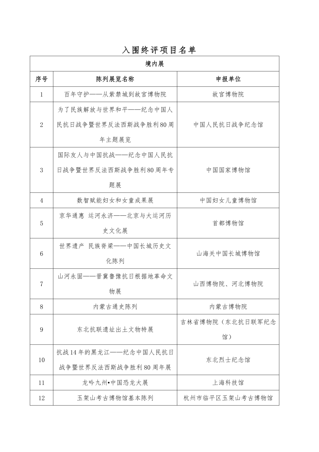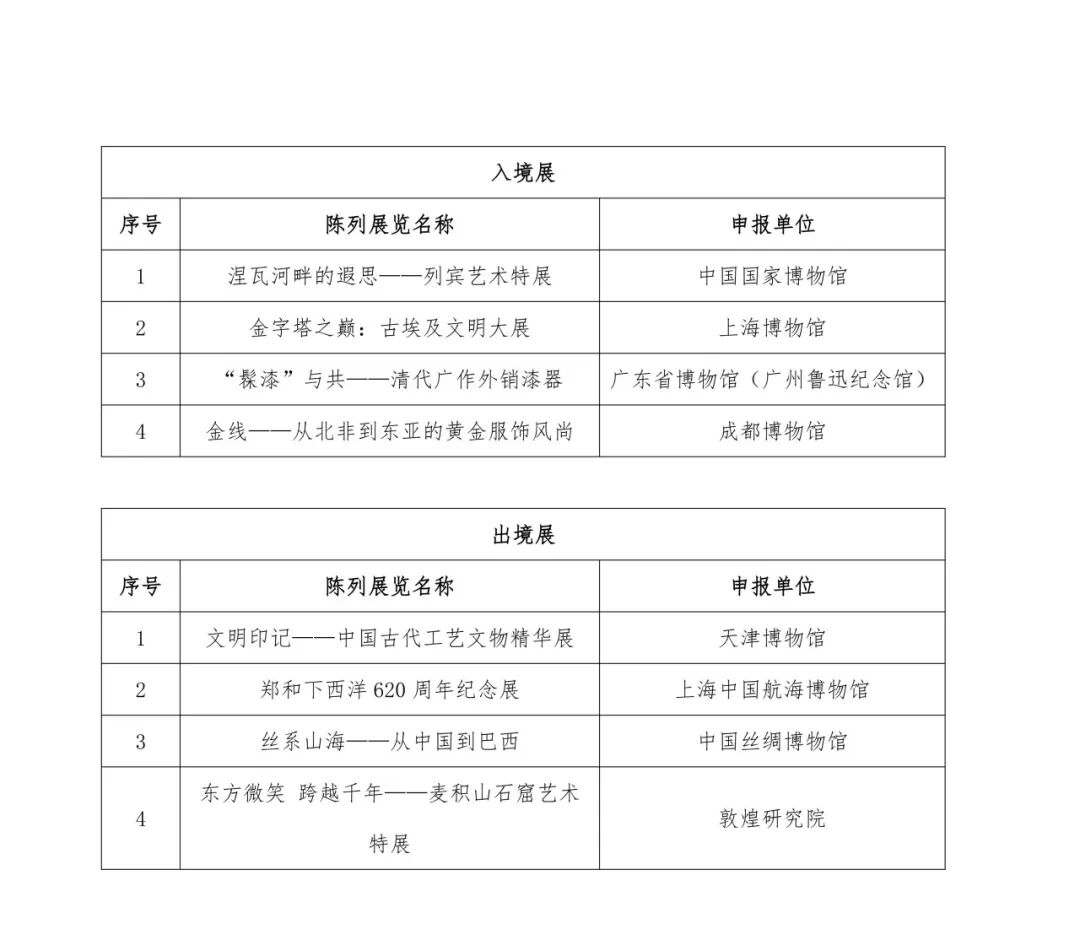 3月26日至28日,在国家文物局指导下,中国文物报社、中国博物馆协会在北京组织召开了第二十三届(2025年度)全国博物馆十大陈列展览精品推介活动初评会,根据《全国博物馆十大陈列展览精品推介办法》,通过审阅申报材料、观看申报项目视频、讨论交流、实名投票等环节,初评评委会对150项申报项目进行了审核、遴选。经国家文物局核准,共计38项展览入围终评,其中境内展览30项,出境、入境展览各4项。4月10日—16日,入围项目向社会进行了公示。