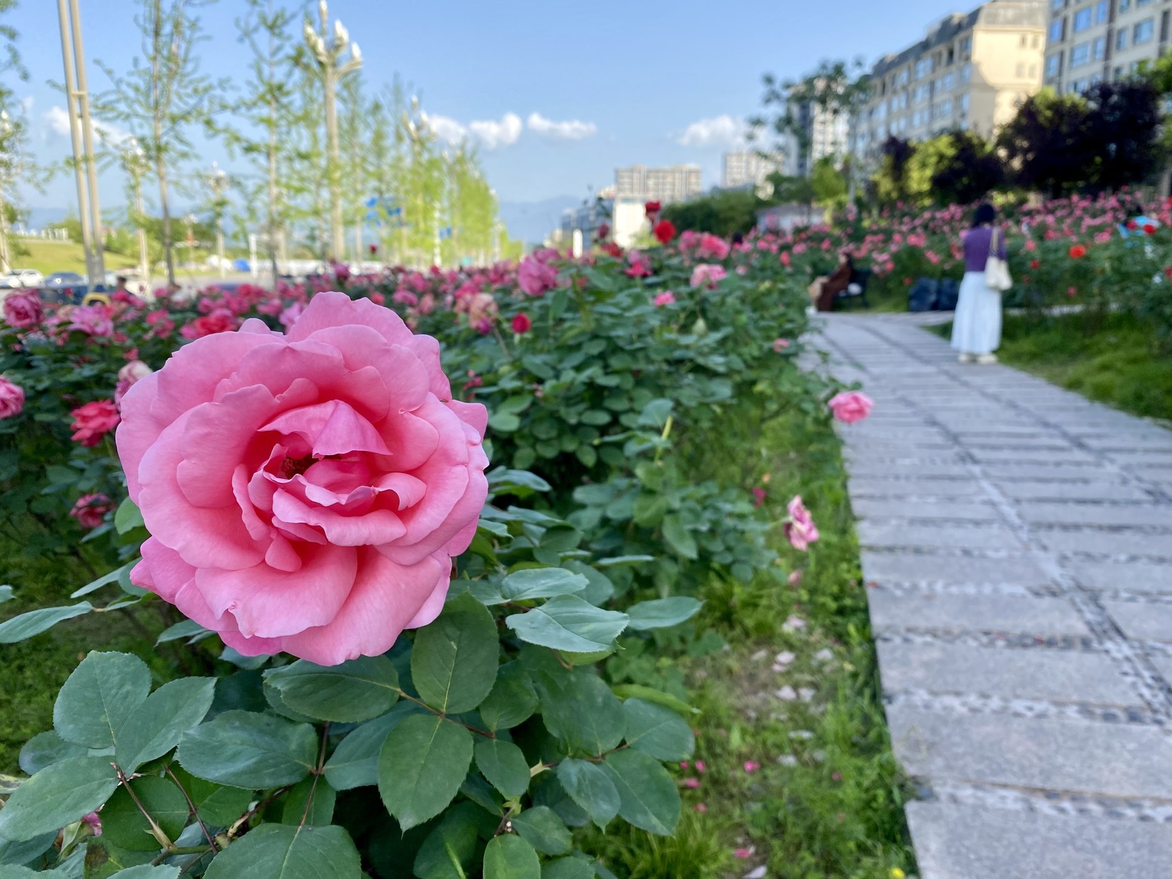 滨江东路上,月季园绵延数百米,红色艳丽、粉色娇嫩,花瓣微微下卷,层层叠叠,在艳阳的照耀下,花瓣犹如涂上了一层明油,光泽而油亮,俯身轻嗅,沁人心脾的清香立刻溢满鼻腔,使人身心舒爽。