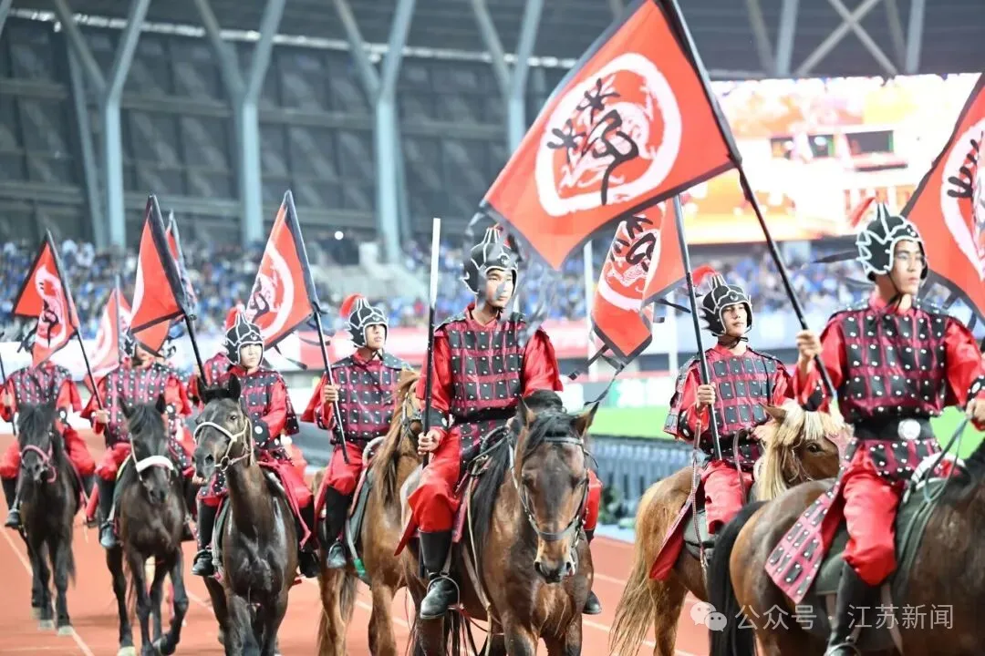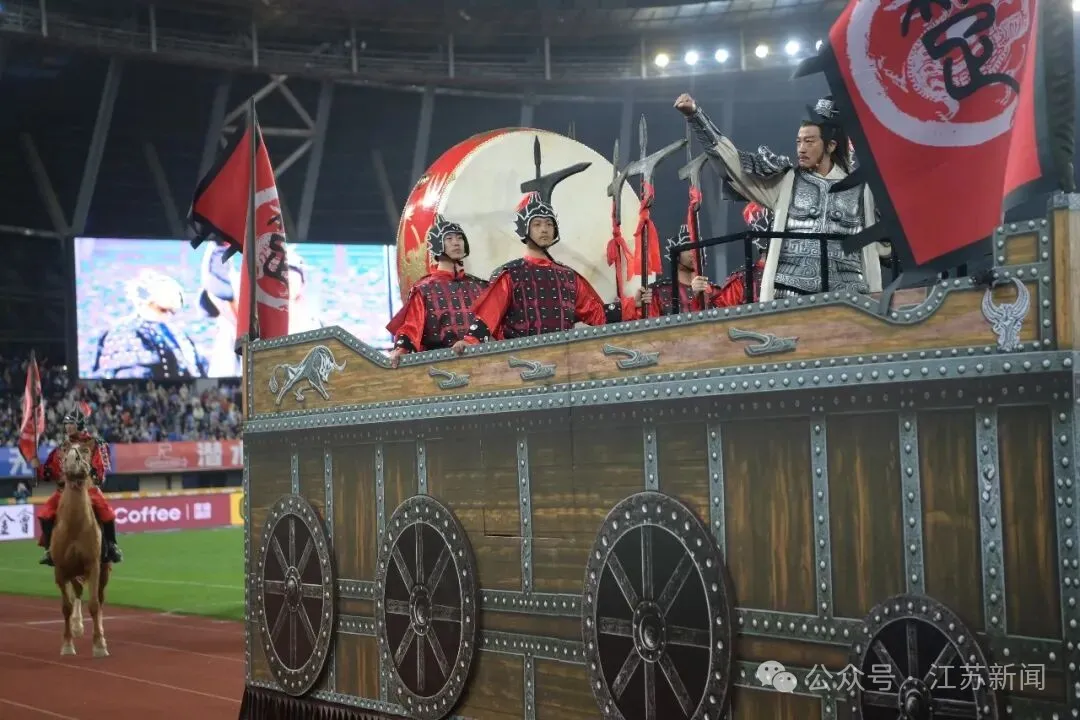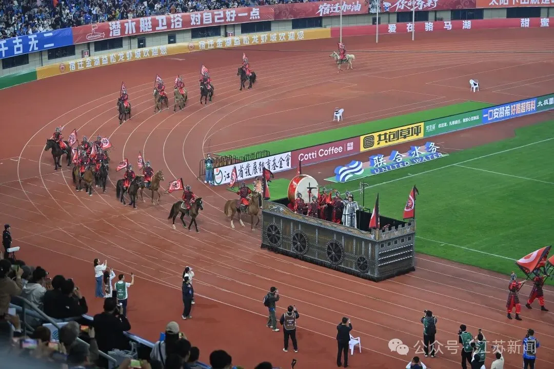 赛前,原创开场演出《霸王归来・燃爆宿迁》惊艳亮相,演员何润东化身西楚霸王项羽,乘战车、伴战鼓、随战马巡场互动,近3万名球迷同声呼应、热血沸腾。