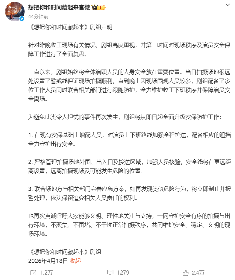 4月18日晚,剧集官微发布声明回应,称当日剧组配备了多位工作人员联合相关部门进行跟随防护,保障演员安全离场。剧方称将全面升级安保防护工作,“如再发现类似危险行为,将立即制止并报警处理,依法保留追究相关人员责任的权利。”