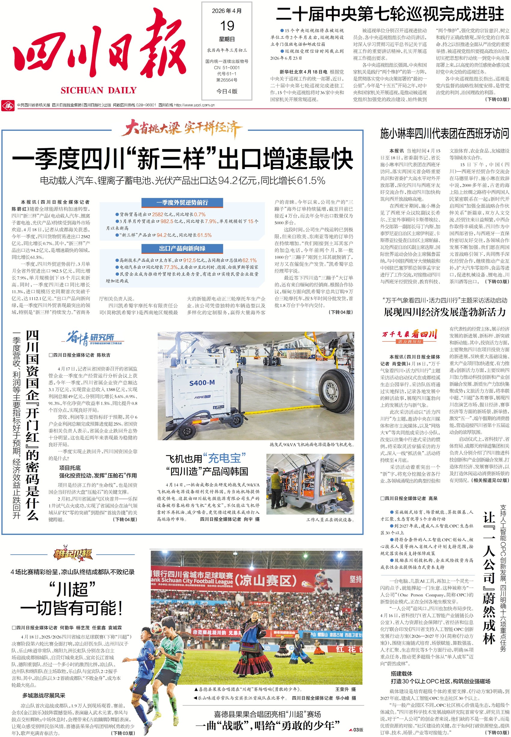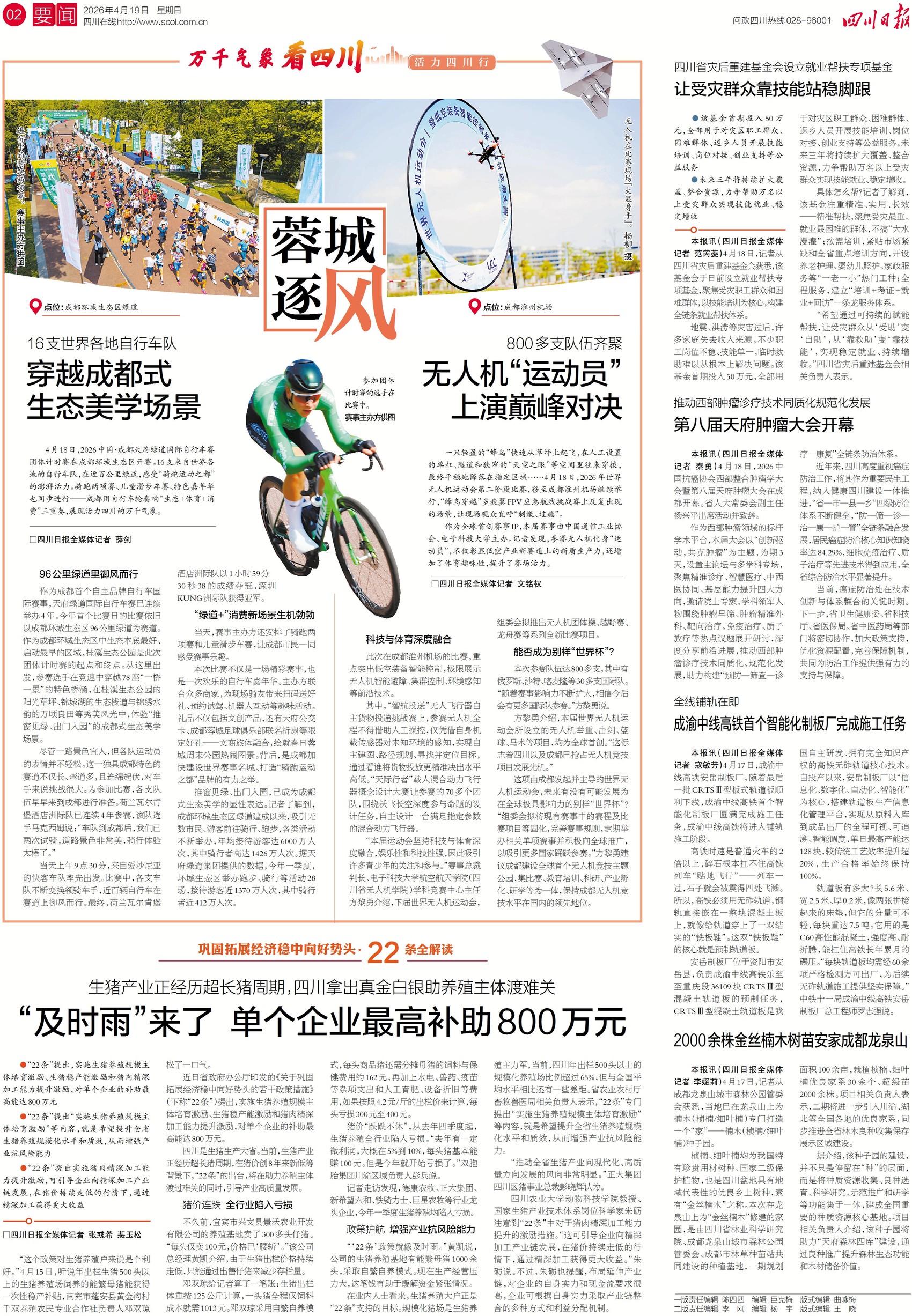 4月18日,“万千气象看四川·活力四川行”主题采访活动启动,记录各地发展中的鲜活故事,书写四川开放活力新篇章。天府绿道国际自行车赛开赛,16支国际车队驰骋96公里绿道,穿越成都式生态美学场景;2026年世界无人机运动会在成都淮州机场继续上演,800余支队伍角逐“蜂鸟穿越”“智航投送”等全球首创赛项,展现低空智能控制前沿技术。今日一、二版,一起感受四川蓬勃发展新气象。