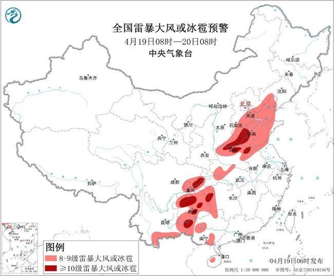 预计4月19日8时至20日8时,华北东部和南部、黄淮大部、江汉西部、西南地区东部和南部、华南西部等地的部分地区将有8级以上雷暴大风或冰雹天气,其中,河北南部、山东中西部、河南中北部和东部、安徽北部、湖南西部、四川盆地东南部、重庆中部、贵州中北部、广西西部等地的部分地区将有10级以上雷暴大风,最大风力可达11级以上;华北南部、黄淮中西部、西南地区东部和南部、华南西部等地的部分地区将有小时雨量大于20毫米的短时强降水天气,其中,重庆中西部、贵州西部和北部、广西西部和南部沿海等地的部分地区小时雨量大于50毫米,最大可达60毫米以上。