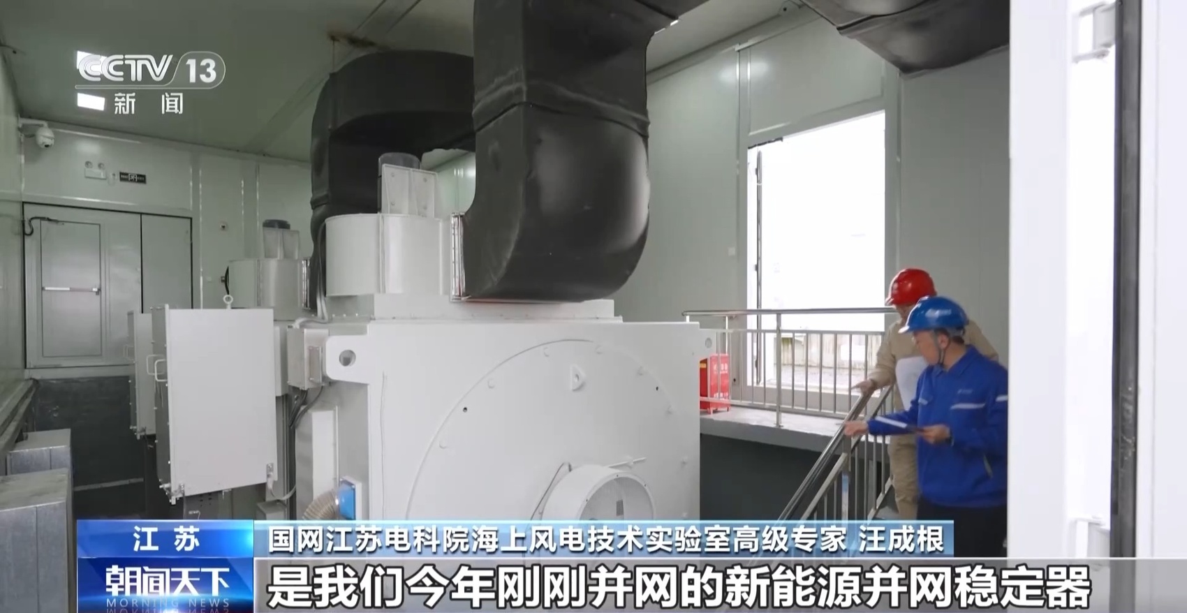 国网江苏电科院海上风电技术实验室主任 刘建:这是我们研发的新能源并网稳定器样机,电动机连着海上风电模拟海上风电,发电机连着大电网。把风电集中起来驱动电动机,再带动发电机旋转,就像给转速波动的风机装上“稳压器”,让输出的电平稳可靠。