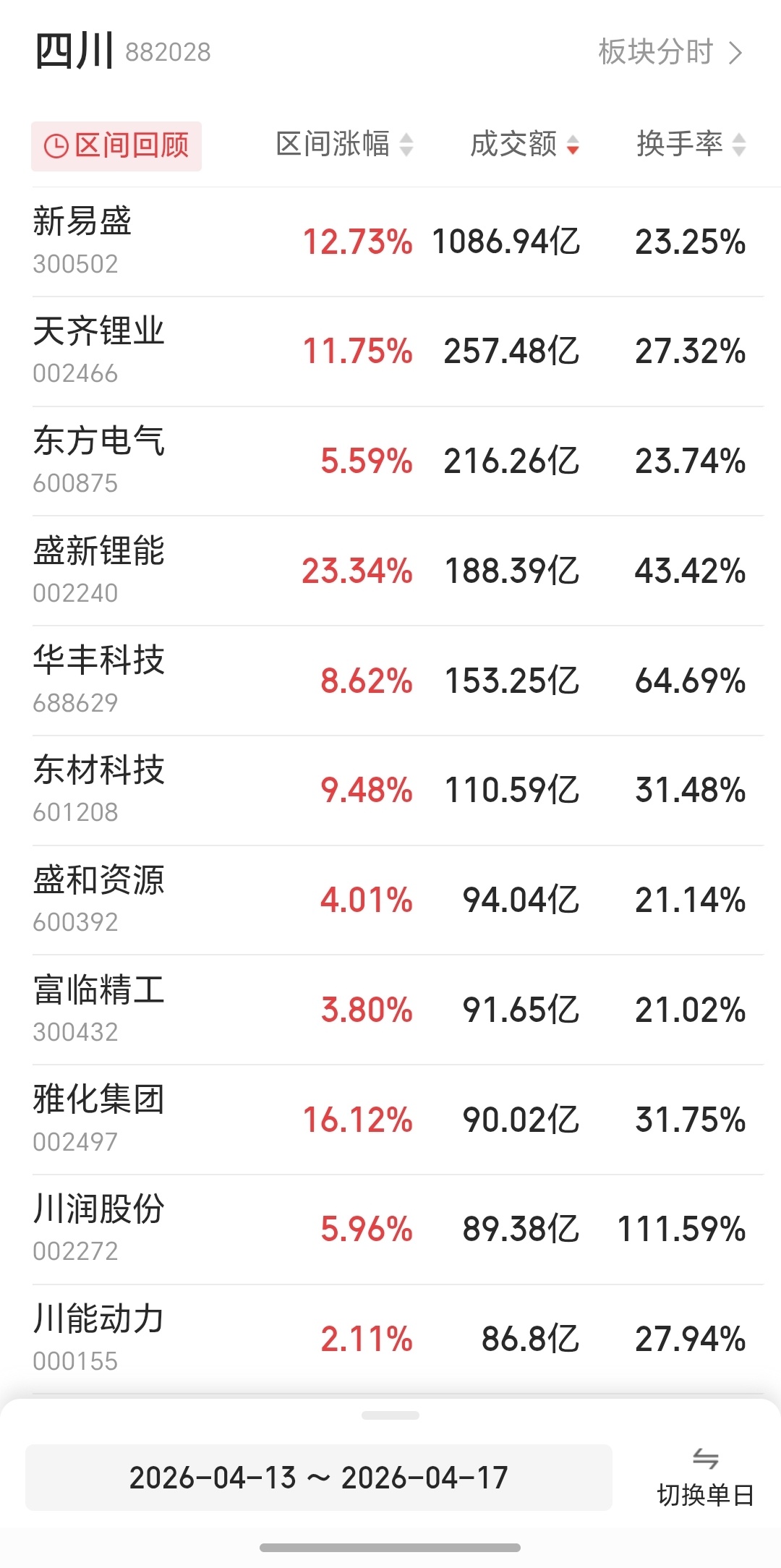 四川板块表现亮眼,连续两周收出阳线。个股方面,川股涨幅榜头部效应显著,其中盛新锂能表现最为突出,周涨幅达23.34%,稳居川股涨幅榜首,成为本周川股的“领涨先锋”。成交活跃度上,川股市值龙头新易盛表现抢眼,本周成交额一举突破千亿元关口,达到1086.94亿元,同时股价接连刷新历史新高,周涨幅达12.73%,总市值成功突破5800亿元,持续领跑川股。此外,天齐锂业、东方电气、华丰科技、东材科技等成交额均超百亿元,成为川股成交主力。