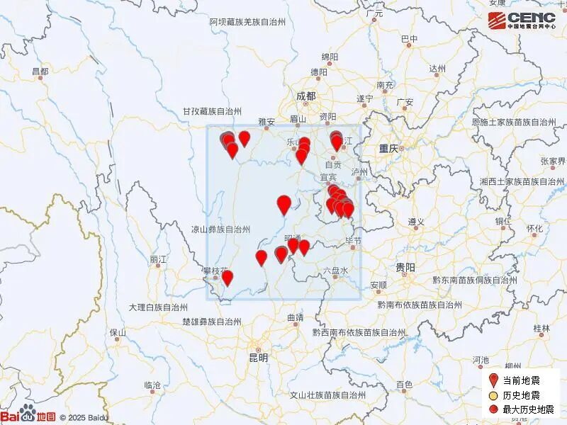 历史地震:根据中国地震台网速报目录,震中周边200公里内近5年来发生3级以上地震共272次,最大地震是2022年9月5日在四川甘孜州泸定县发生的6.8级地震(距离本次震中215公里),按震级大小前50次历史地震分布如图。
