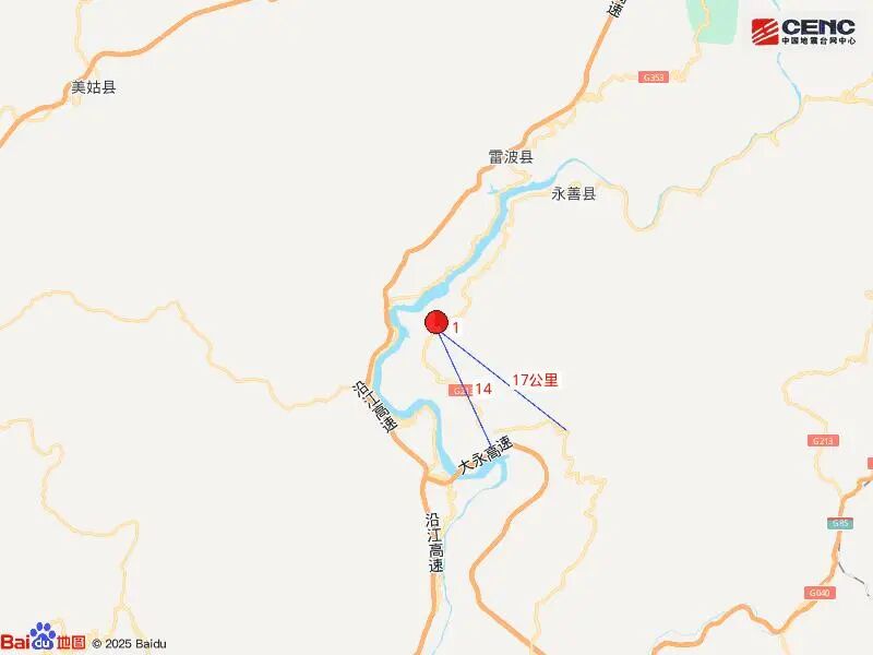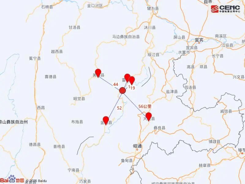 周边县城:震中距四川雷波县18公里、距永善县19公里、距四川美姑县44公里、距四川金阳县52公里、距大关县56公里,距昭通市89公里,距昆明市366公里,距成都市288公里。