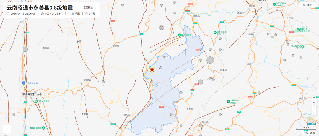 据中国地震台网正式测定,4月18日22时26分在云南昭通市永善县(北纬28.11度,东经103.50度)发生3.8级地震,震源深度10千米。