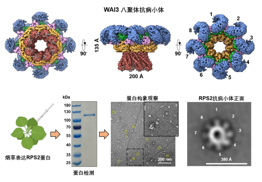 结果显示,激活态WAI3组装为八聚体抗病小体,整体呈环状“漏斗”结构,直径约200 Å、高约135 Å。