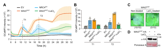 由于钙离子是细胞中一种极其重要的“第二信使”,其浓度剧烈波动,会像多米诺骨牌一样,触发下游一系列防御基因的表达。这说明WAI3GOF形成钙离子(Ca2+)通道引发胞质钙离子内流,从而激活免疫反应。