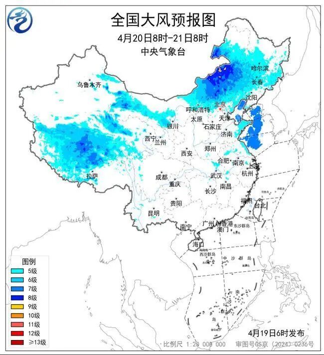 预计,4月19日08时至20日08时,新疆东部和南疆盆地、内蒙古大部、山西、河北大部、北京西部和北部、天津、山东西部和北部、河南中北部、黑龙江西部和南部、吉林中西部、辽宁中西部、宁夏、陕西中北部、甘肃北部、青海北部、西藏中西部等地部分地区有5~7级风,阵风8~9级,其中新疆东部山口地区和南疆盆地东部、内蒙古中部、河北南部、河南中北部局地有8~9级风,阵风10级以上;渤海、渤海海峡、黄海北部海域、黄海中西部和西南部海域将有7~8级、阵风9级的大风。