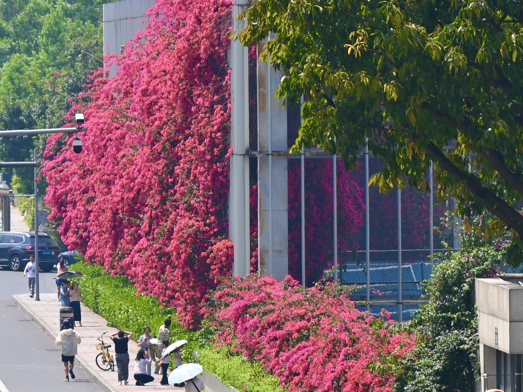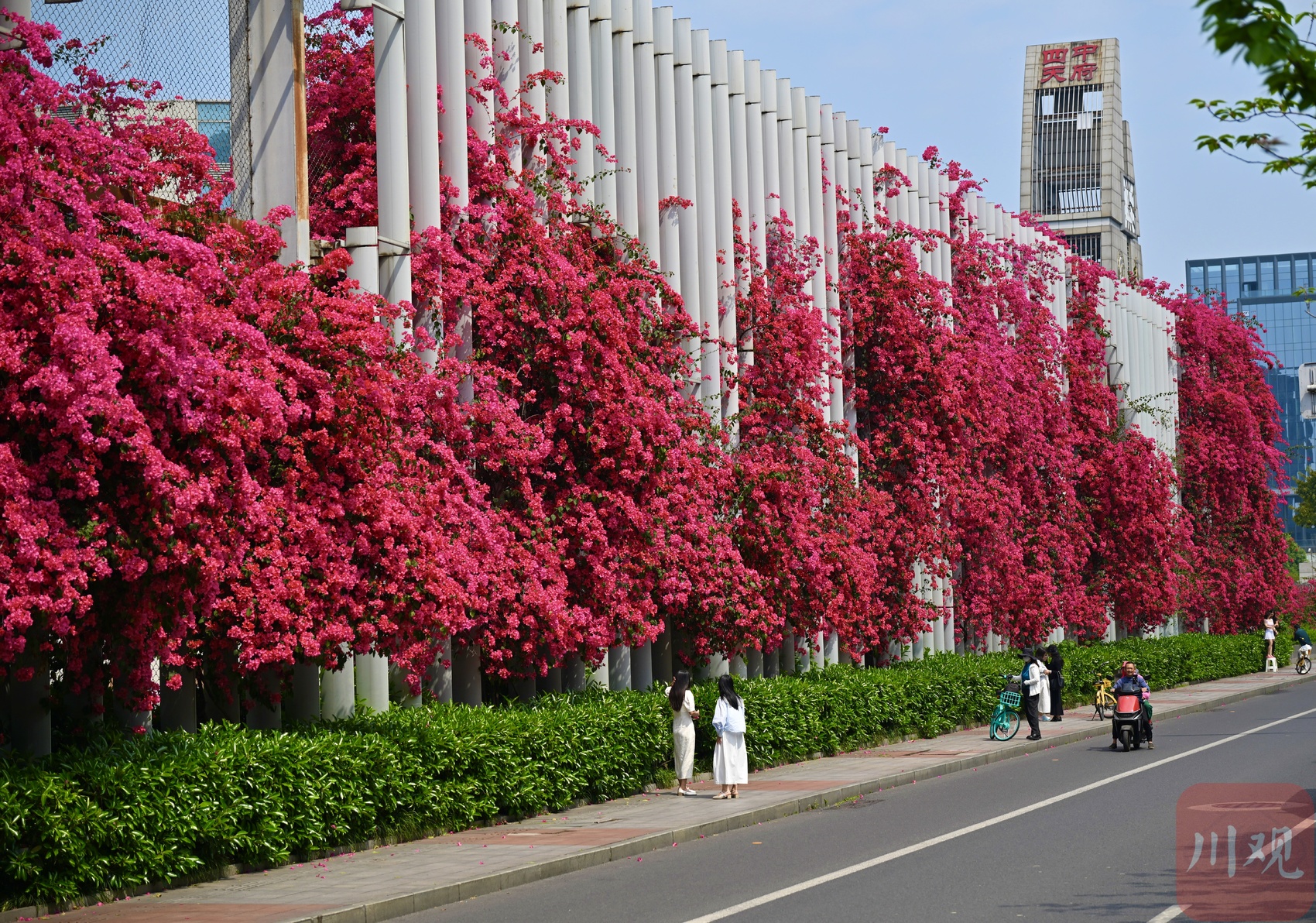 4 月 19 日,成都剑南大道北段、石室天府中学交子校区旁,三角梅迎来盛放期。花枝从围墙顶端倾泻而下,绵延成片,像一道玫红色花瀑垂到路边,热烈又浪漫。