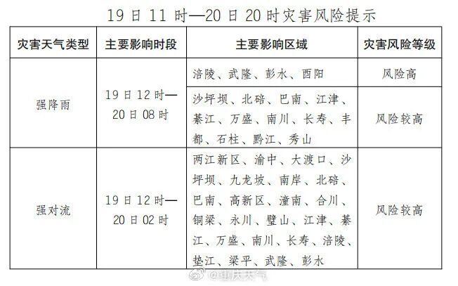 4月19日,@重庆天气发布气象预警:19日11时到20日20时,重庆中西部和东南部需防范暴雨和强对流天气灾害。