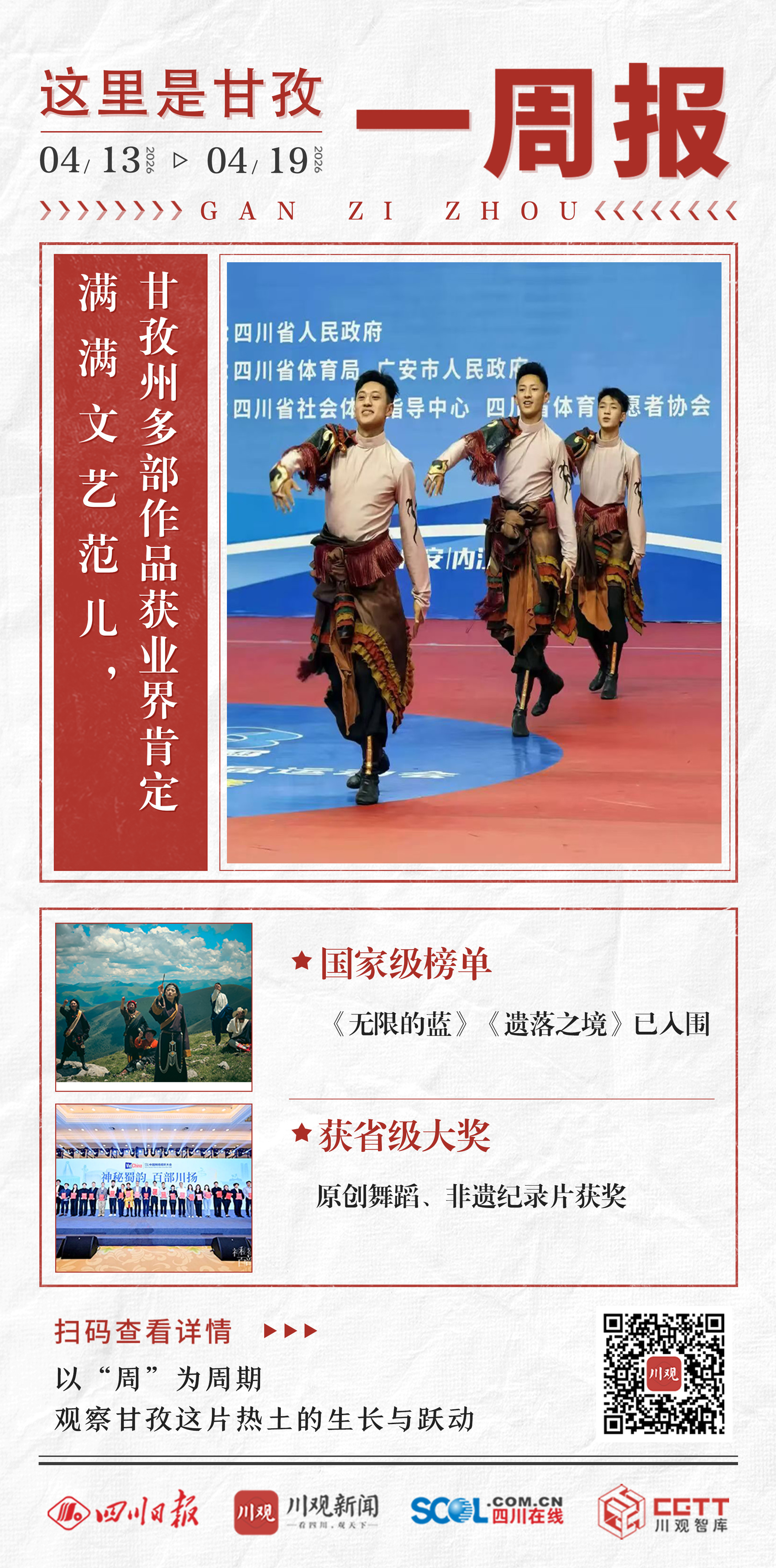 本周(4月13日至19日),甘孜州文艺范儿十足,不仅原创歌曲和微短剧入选了国家榜单,网络纪录片和原创舞蹈还获了奖,收获满满。