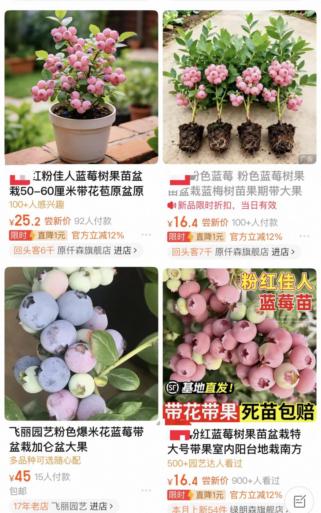 某蓝莓种植户在网络上晒出自己种植粉色蓝莓的经历,他已经连续种植了四年,一直都结不出期待中的果实。电商平台上粉色蓝莓树苗销量火爆,不少商家打出“南北可种、当年结果、挂果率95%”等宣传口号。