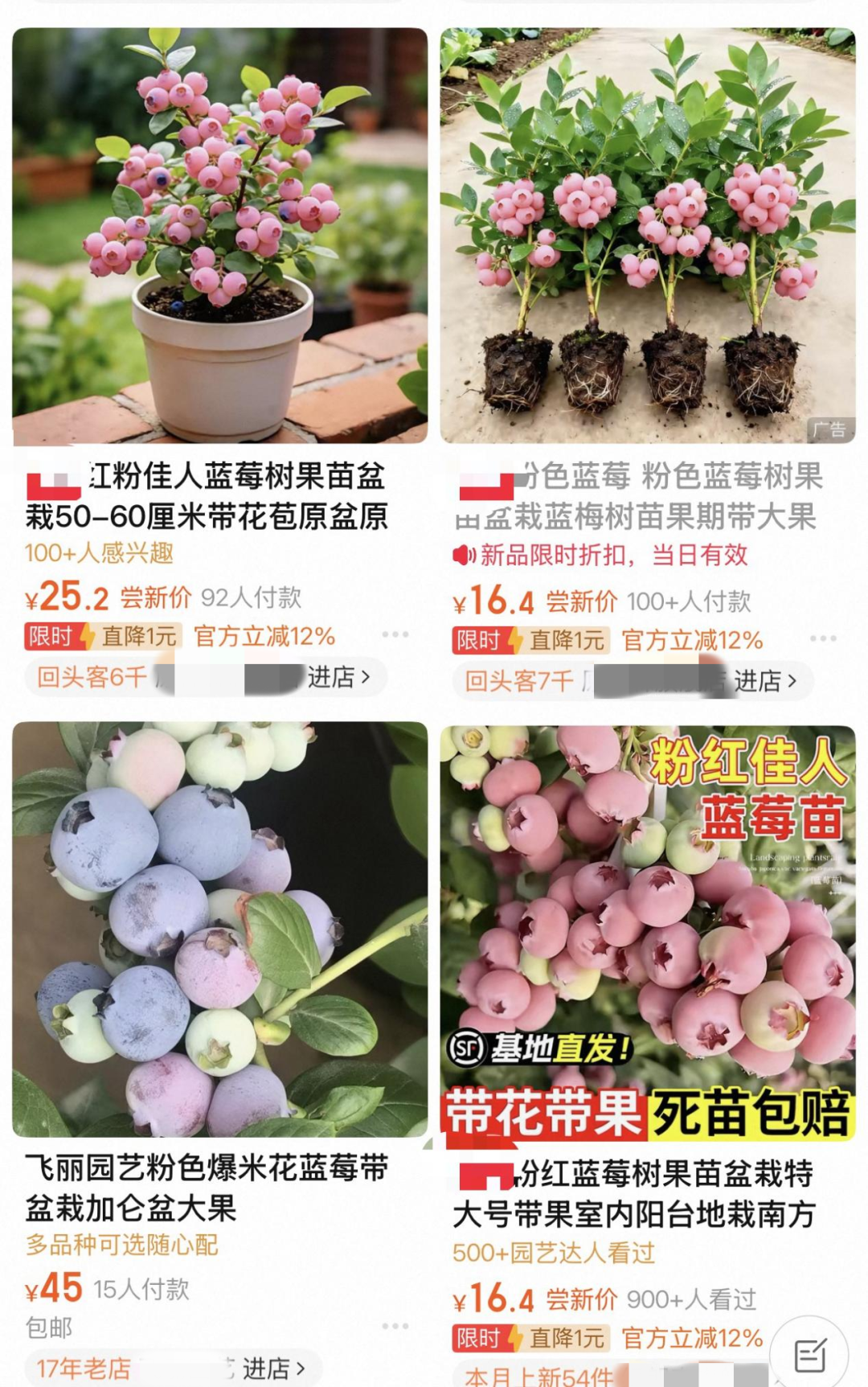 尽管粉色蓝莓买不到,但打开购物平台,各类粉色蓝莓树苗在网上热销。一些社交平台上,种植粉色蓝莓成为新热潮。那么,购买的树苗真的是粉色蓝莓树苗吗?普通消费者能种出粉色蓝莓吗?