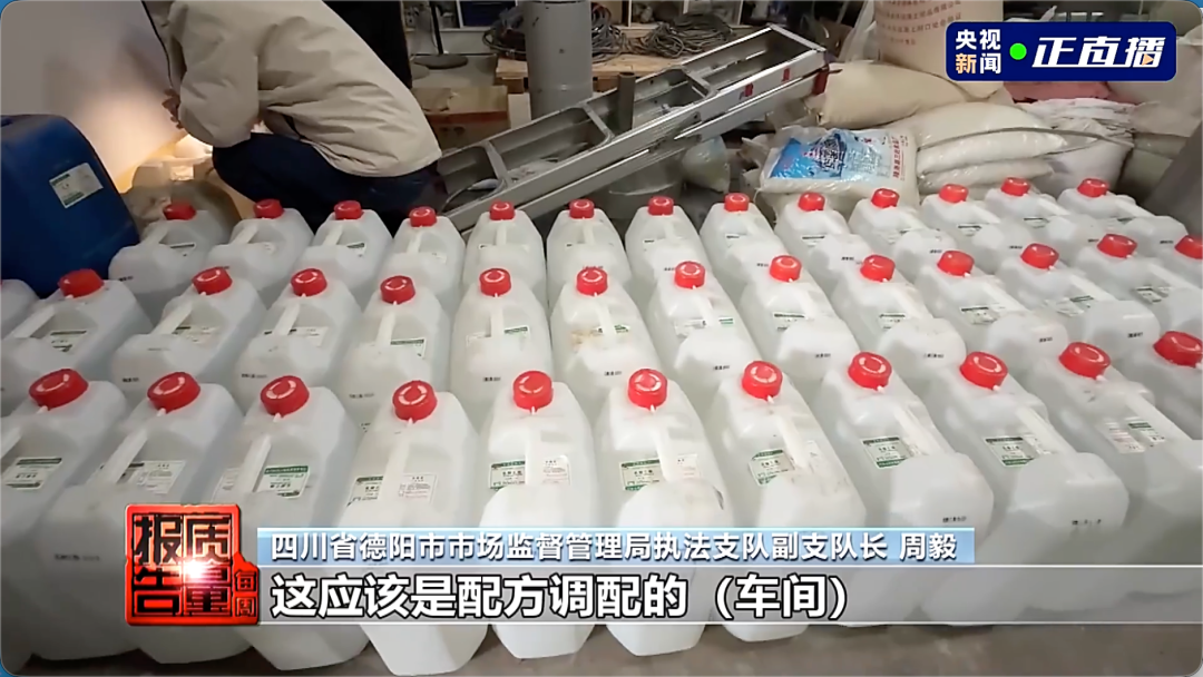在山西文水县南安镇武后乡酒业有限公司,记者看到这家酒厂的院子中央安装了四排食用酒精不锈钢储酒罐;在储酒罐北边厂房的一间杂物间,执法人员找到了这家酒厂的核心中枢——调配车间。