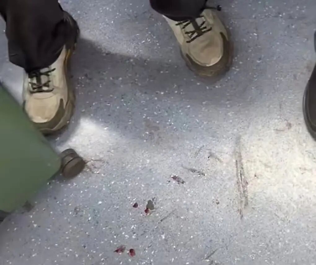 视频里,男子携带的是一个绿色箱子,他手里还拿着纸巾,疑似在擦拭血渍。