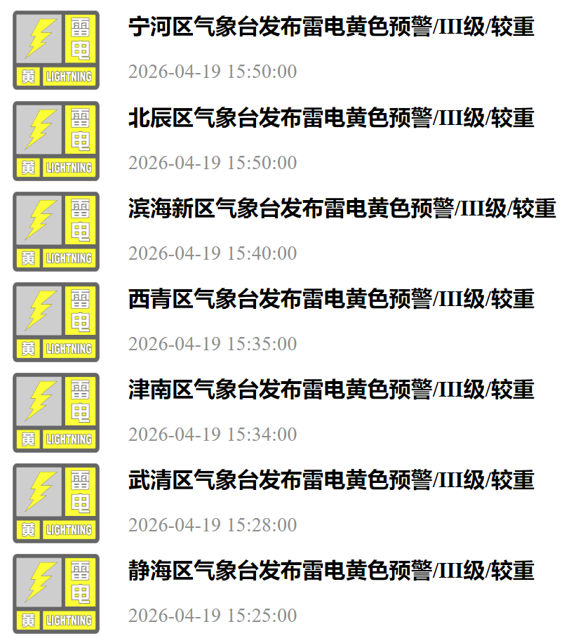 滨海新区气象台于2026年04月19日15时40分发布雷电黄色预警信号:预计未来6小时内,滨海新区所有街镇将出现雷阵雨,并伴有短时大风和局地小冰雹,请有关单位和人员做好防范准备。