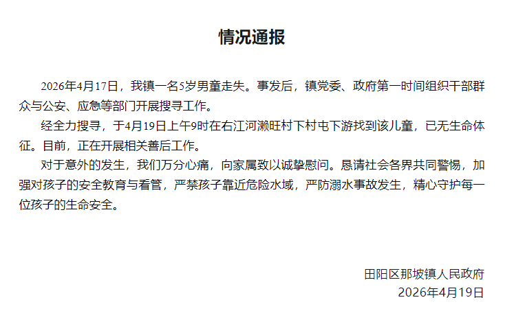 经全力搜寻,于4月19日上午9时在右江河濑旺村下村屯下游找到该儿童,已无生命体征。目前,正在开展相关善后工作。