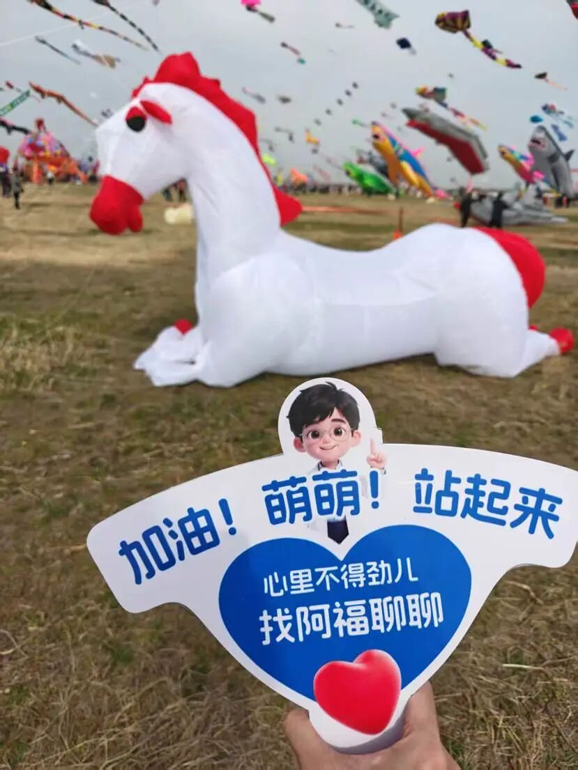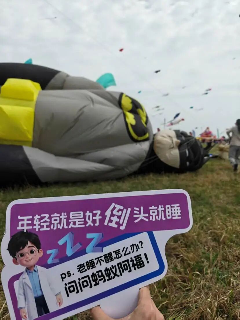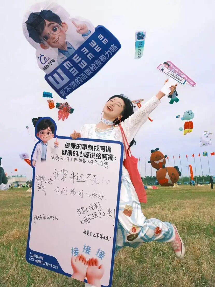 蚂蚁阿福的视力表风筝没有争奇的造型,没有斗艳的颜色,空中的“阿福”戴着眼镜翘着嘴角比着手势,瞪着大眼睛看着地上的人们进行着“视力大挑战”,充满关心的眼神放在在提醒你:抬头护眼、护颈椎、关注健康。汹涌的风筝潮中,把健康提醒直接放上天空,操心着每一个追风筝的人的健康。