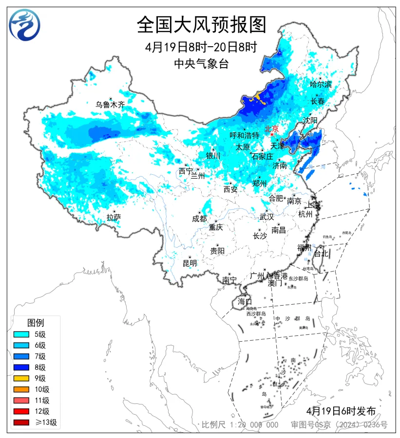 预计,4月19日08时至20日08时,新疆东部和南疆盆地、内蒙古大部、山西、河北大部、北京西部和北部、天津、山东西部和北部、河南中北部、黑龙江西部和南部、吉林中西部、辽宁中西部、宁夏、陕西中北部、甘肃北部、青海北部、西藏中西部等地部分地区有5~7级风,阵风8~9级,其中新疆东部山口地区和南疆盆地东部、内蒙古中部、河北南部、河南中北部局地有8~9级风,阵风10级以上;渤海、渤海海峡、黄海北部海域、黄海中西部和西南部海域将有7~8级、阵风9级的大风。