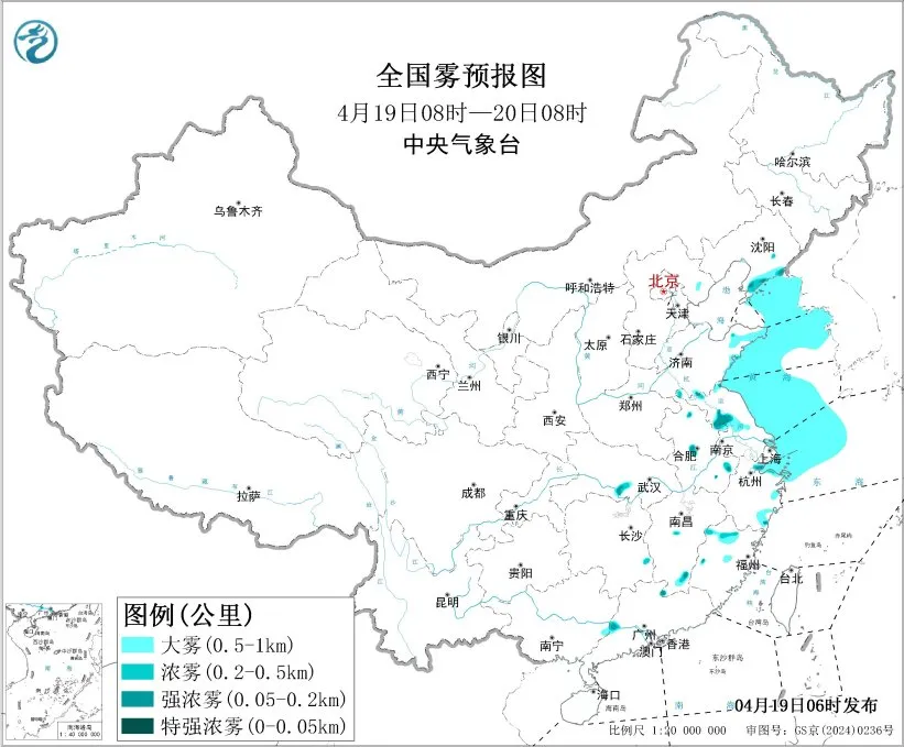 中央气象台4月19日06时继续发布大雾黄色预警: