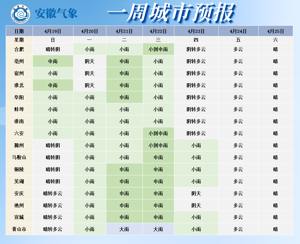 19日夜里(周日):淮河以北和江淮之间北部阴天有小雨,其中淮河以北部分地区中雨;其他地区多云到阴天。20日(周一):全省阴天,沿淮淮河以南大部分地区有小雨。21日(周二):全省阴天有小到中雨,江南部分地区大雨。22日(周三):全省阴天。淮河以北有小雨;淮河以南有小到中雨,其中江南部分地区大雨。23日(周四):全省阴天转多云,江北东部和江南部分地区有小雨。24日(周五):全省多云。