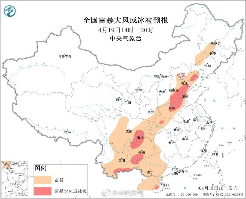4月19日至23日冷空气影响我国,带来大风、降雨、强对流等天气。中央气象台19日发布大风黄色和强对流天气蓝色预警,预计19日至20日,河北南部、山东中西部、河南中北部和东部、安徽北部、湖南西部、四川盆地东南部、重庆中部、贵州中北部、广西西部等地有10级以上雷暴大风或冰雹天气,最大风力11级以上;重庆中西部、贵州西部和北部、广西西部和南部沿海等地的部分地区小时雨量大于50毫米,最大可达60毫米以上。