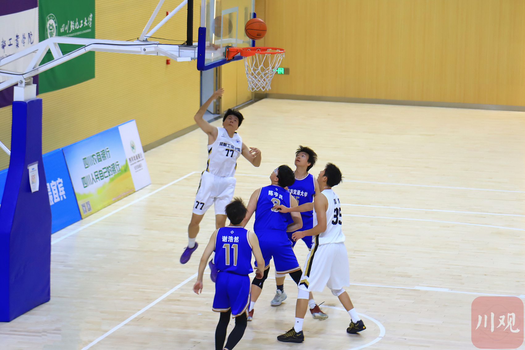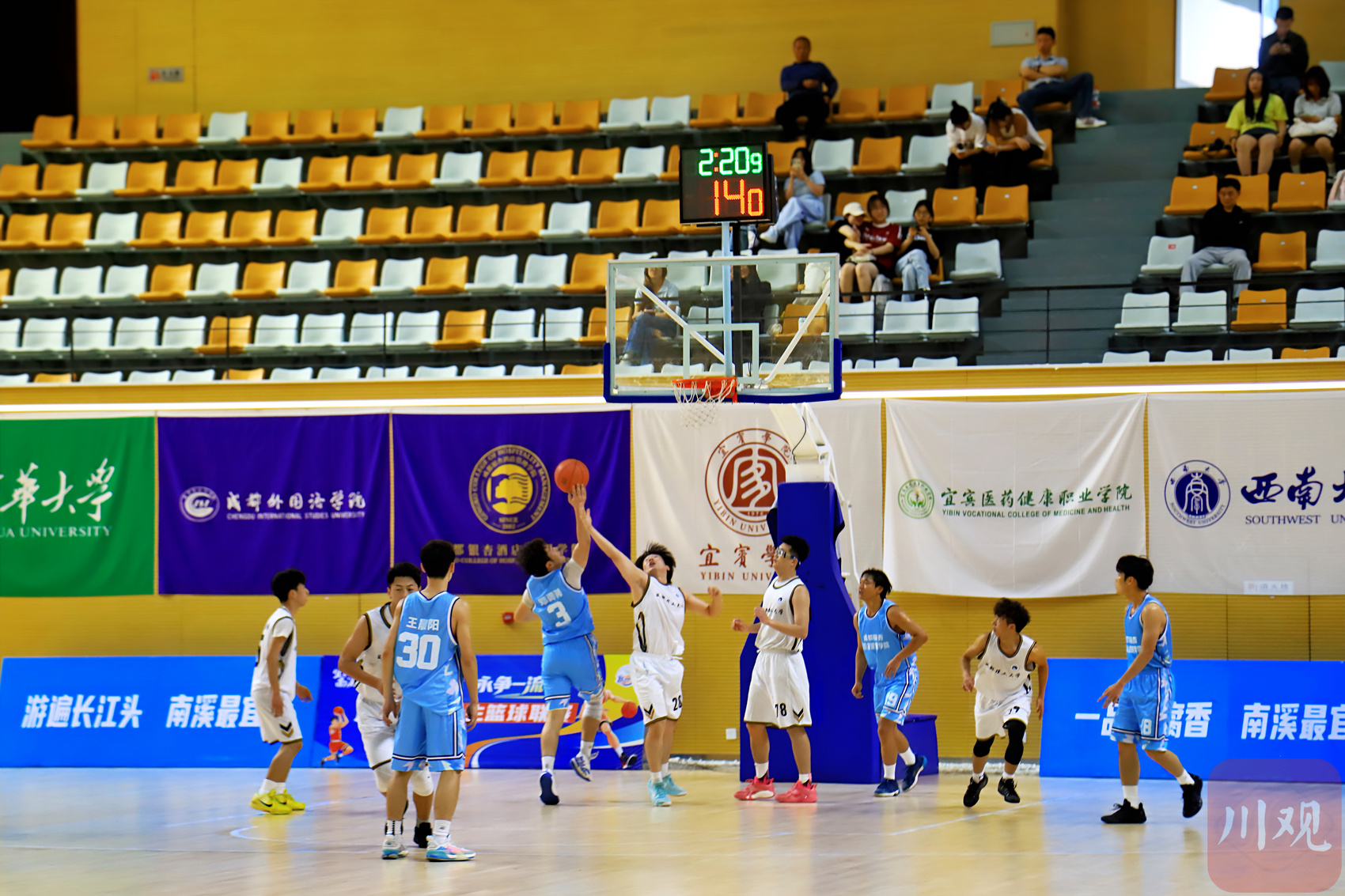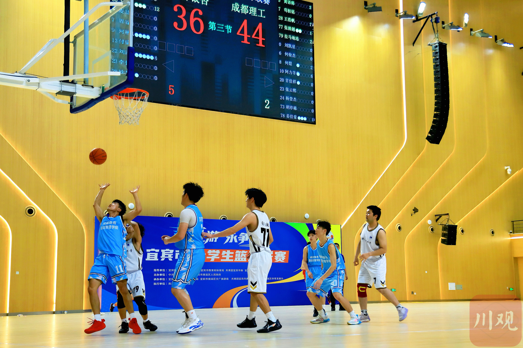 当日的篮球赛场,六场比赛同时激战。成都工业学院、西南交通大学、宜宾学院、西华大学、四川轻化工大学等高校展开角逐。球员们在场上奋力拼抢篮板、精准传导配合,每一次得分都引爆现场欢呼,青春活力在赛场持续迸发。
