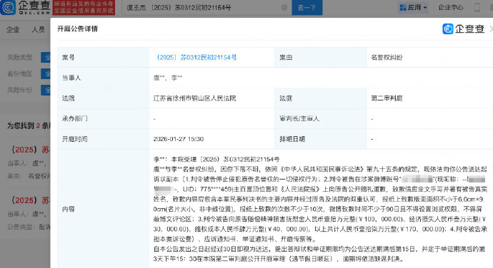 另据企查查APP显示,该案曾于1月27日开庭审理,法院向被告李某公告送达起诉状副本,原告虞丕杰诉求为判令被告停止侵犯原告名誉权的一切侵权行为,要求被告在其账号主页置顶位置和《人民法院报》上公开赔礼道歉,并赔偿精神损害抚慰金、经济损失、维权成本合计17万以及本案诉讼费。