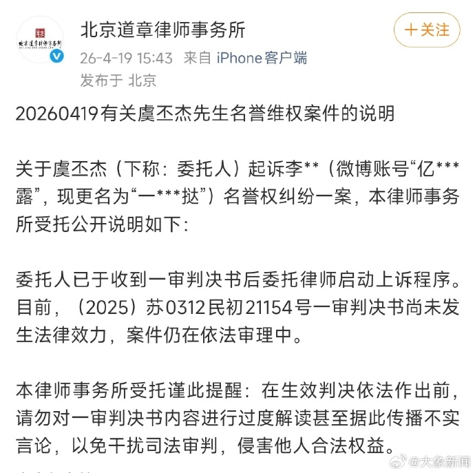 对此,虞书欣父亲律师北京道章律师事务所 发文:有关虞丕杰先生名誉维权案件的说明,关于虞丕杰(下称:委托人)起诉李**(微博账号“亿***露”,现更名为“一***挞”)名誉权纠纷一案,本律师事务所受托公开说明如下: